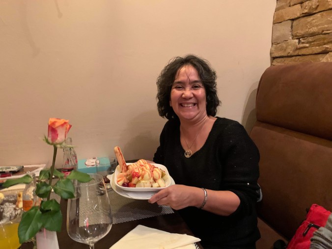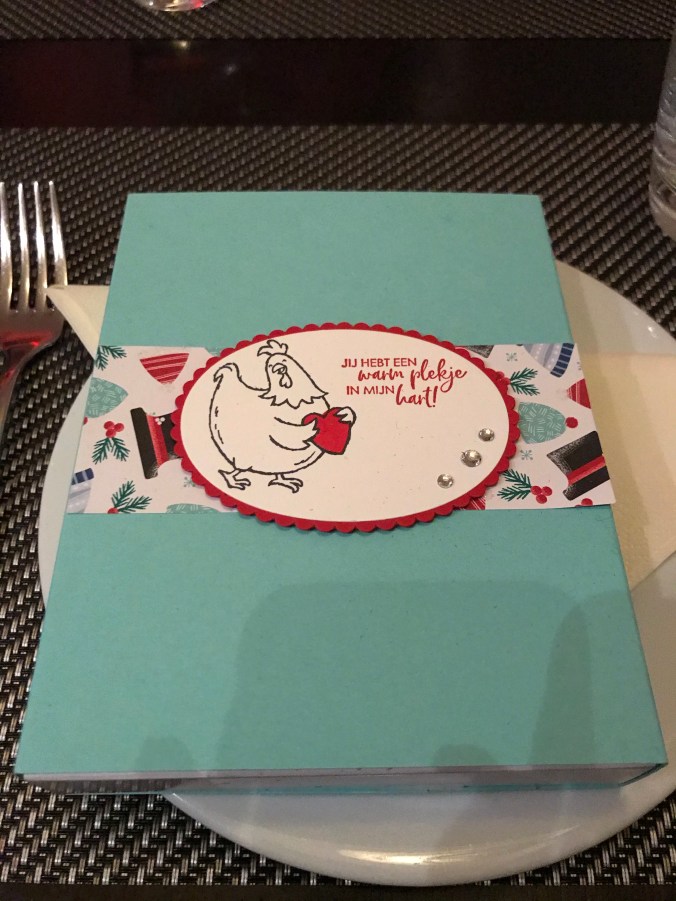 Gisteravond hebben we heerlijk gegeten bij de Italiaan. Toen we bij de tafel kwamen lag er een lief cadeau op ons te wachten: een chocolade letter van Maaike. Prachtige verpakking.