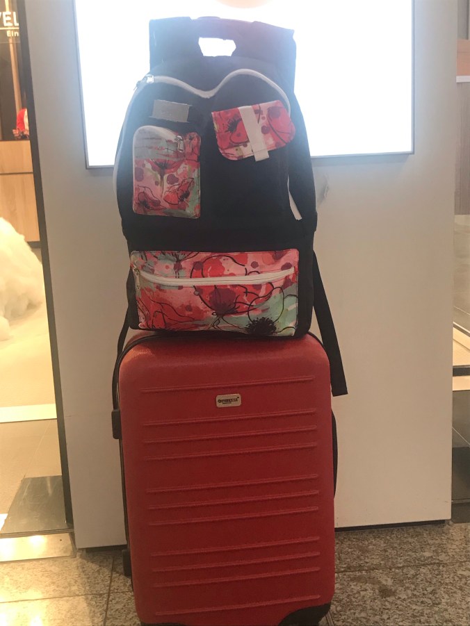 Alhoewel onze vlucht verlaat was heeft de piloot goed doorgevloge n dus viel de vertraging mee. En mijn mooie Stampin’Up! rugzak mocht mee.