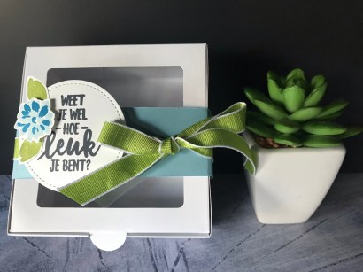 Vandaag ga ik gauw verder aan mijn 2 lopende opdrachten. Ik mag nog 4 doosjes maken. Het model dat we op de demodag bij Kaylee en Helene hebben gemaakt.