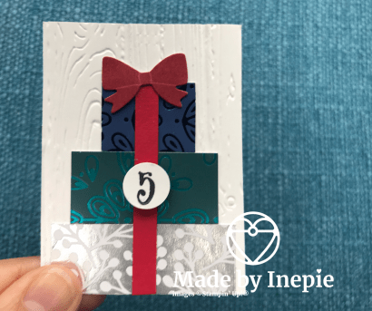 Mijn kaartje van vandaag heb ik eerst ge-embossed met de mooie Pinewood Planks embossingfolder. Daarop heb ik rest stukjes DSp geplakt. Het strikje had ik nog over van de Christmas Countdown Project Kit. En een dun strookje Real Red Cardstock vormt het lint. Heel eenvoudig gemaakt van restjes maar ik vind het Superleuk geworden. En de eerste rij van mijn lijst is al vol met zelfgemaakte kaartjes.