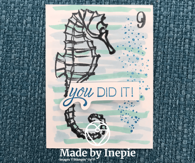Mijn kaartje voor vandaag is ook superleuk voor als een kind zijn of haar zwemdiploma heeft gehaald. Ik heb eerst met Blends strepen gemaakt gewoon uit de vrije hand. Daar het zeepaardje opgestempeld in Memento Tuxedo Black inkt en daarna nog de bubbeltjes en het cijfer. De tekst( Uit Parcels & Petals) heb ik op een reststukje Whisper White gestempeld en uitgeknipt met mijn Paper Snips: Easy Peasy.
