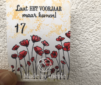 Het kaartje van vandaag is een Sneak Peek van de prachtig stempelset Painted Poppies. Het is onderdeel van een suite Peaceful Poppies met 2 bundels stempels en bijpassende Dies, Dsp, Sequins, lint en zelfs Peaceful Poppies Elements ( een set met voorgedrukte elementen die je uit kunt drukken op zwart cardstock, dik wit cardstock, vellum en 2 vellen watercolor papier). Ik word hier echt vrolijk van! Vanaf 3 januari kunnen jullie het ook bij ons bestellen. We helpen jullie graag!
