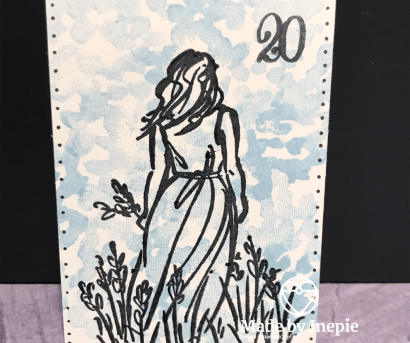 De achtergrond komt uit de Beautiful Friendship set en heb ik gestempeld in Seaside Spray. De mooie dame in Memento Tuxedo Black. Meer heeft dit kaartje niet nodig. Als het een grote kaart was zou ik er nog een mooie tekst boven doen.