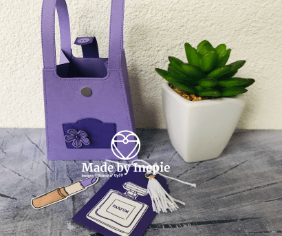 Op OnStage zag ik de demonstratie van deze suite en was meteen verkocht. Je kunt van het tasje namelijk ook een rugzak maken en nog een ander model tas. Er zitten Dies bij voor gespen en knoopjes en voor de stempels uit de set zoals de door mij hier gebruikte parfumfles en lippenstift.