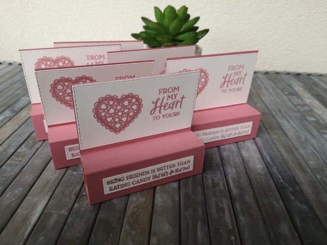Eerst retired cardstock gepakt en een lineaal en al metend en rekenend kwam ik hier op uit. De maat is super want er kunnen zelfs 3 reepjes Merci in. De Snickers, Mars, Milky Way en de mini Brosjes passen perfect. Ik heb er een flapje aan gedaan zodat je een boodschap erop kwijt kunt. Deze heb ik gemaakt met de Heartfelt stempelset. Deze staat op pagina 9/10 van de nieuwe Mini catalogus en is leuk voor Valentijnsdag. Hier kan je deze Swap ook perfect voor gebruiken.