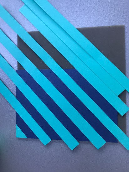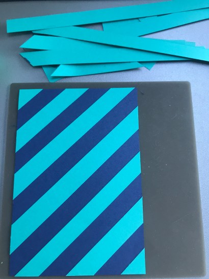 Ik was bezig geweest met een project en daar hield ik stukken Cardstock van over waar ik niet zoveel mee kon. Dus heb ik stroken Bermuda Bay van 1/2″ gesneden met mijn Papertrimmer en schuin op een mat van Night Of Navy geplakt. Ik legde steeds een strook los ertussen om de juiste afstand te houden.