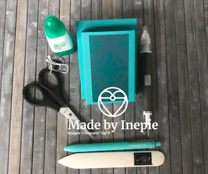 Ps zoals ik al hier op mijn blog al had geschreven heb ik het zakdoeken doosje in mijn favoriete kleur Bermuda Bay gemaakt met het mooie Noble Peacock Specialty Dsp. Op mijn filmpje van gisteren zie je dat ik er ook een standaard voor mijn basis producten van heb gemaakt. Hierin past mijn Paper snips, Tombow lijm,Bonefolder,pen en mijn Take Your Pick tool. Helemaal blij mee!