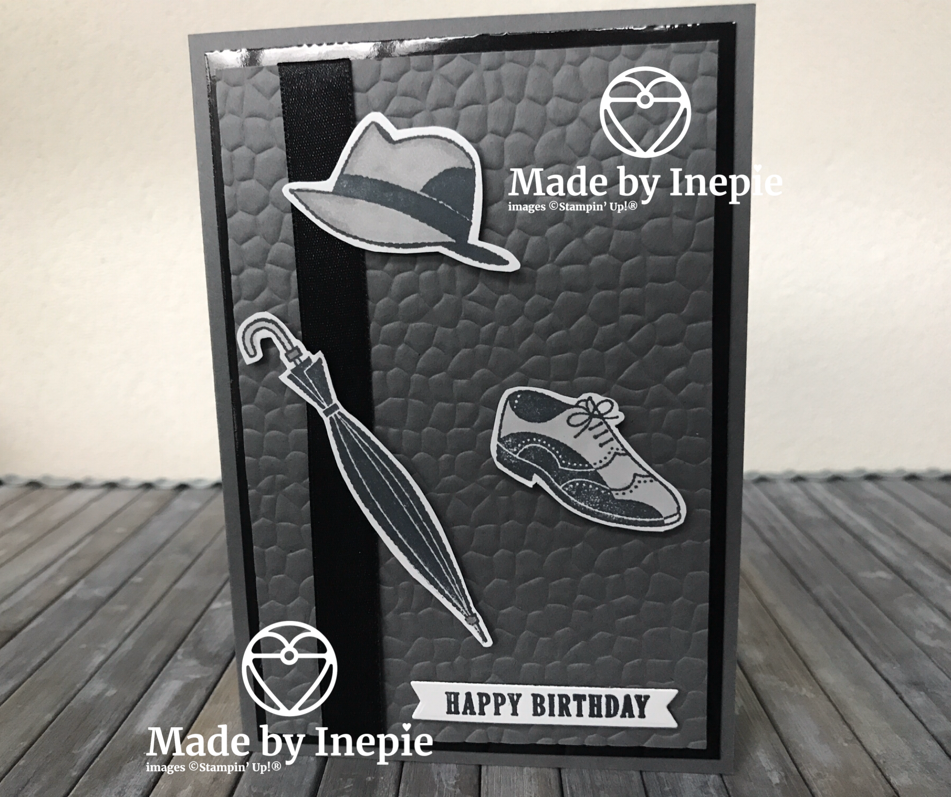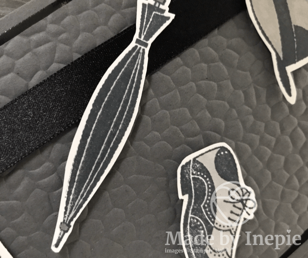 Ik heb er een stuk Black Satin Ribbon onder gedaan. Daar bovenop heb ik de paraplu, hoed en de schoen met Dimensionals geplakt. Ik heb ze ingekleurd met mijn Stampin’Blends en uitgeknipt met mijn Papersnips.
