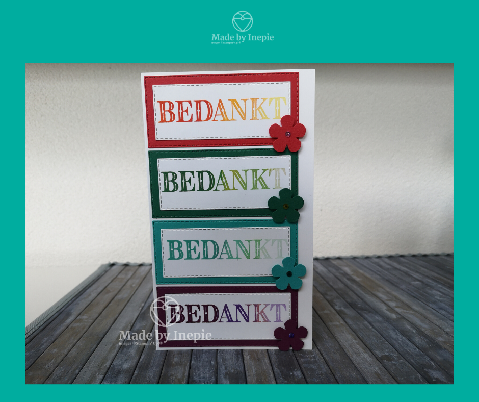 Mijn tweede kaartje heb ik op de zelfde manier gestempeld maar ik heb de woordjes uitgestanst met een kleine stitched rechthoek en daarna opgeplakt op een grotere stitched rechthoek in een bijpassende kleur. Deze 4 woordjes heb ik op een Whisper White kaart geplakt en uit iedere kleur heb ik een bloem geponst met de Small Bloom Punch en ook hier heb ik de Noble Peacock Rhinestones gebruikt als hartje van de bloem.