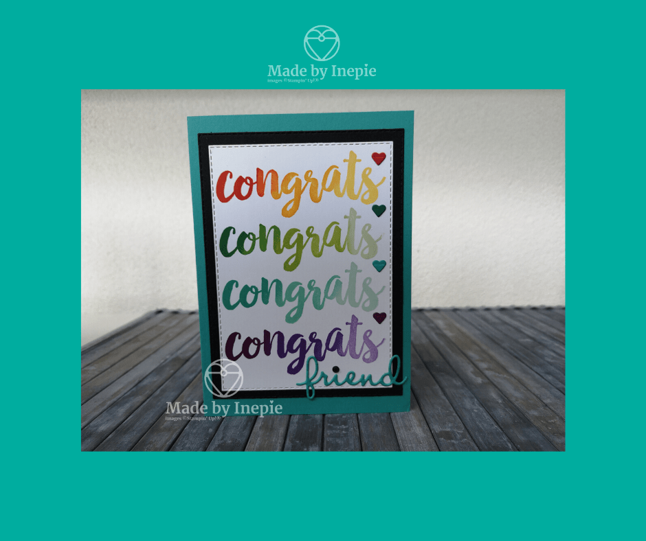 Je zet een stuk Whisper Whitecardstock vast met de 2 magneten en nu kun je gaan stempelen. Met de lichtste kleur bestempel je de hele stempel, dan met de tweede kleur 2/3 gedeelte van de stempel en waar de overgang is even met een spons dauber vervagen anders krijg je van die harde lijnen. Met de laatste ( de donkere) kleur stempel je alleen de eerste 2 letters en vervaag je de overgang weer. Dan is je eerste woord klaar en verzet je je stempelblad een stapje naar beneden en doet hetzelfde weer maar dan met de andere kleuren groep. Super leuk effect toch? Ik heb daarna de woorden uitgestanst met de een na grootste rechthoek van de Rectangle Stitched Framelits Dies. Met de grootste rechthoek heb ik een mat van Basic Black Cardstock gestanst. En deze op een basiskaart van Bermuda Bay geplakt. Uit de Well Written stansen set heb ik het woordje Friend gestanst en 4 hartjes in de bijpassende kleuren cardstock. Voor de Bling Bling heb ik een Noble Peacock Rhinestone gebruikt. De Hinge-Step techniek vind ik echt een geweldige techniek. En dit kunnen andere stempelhulpen zoals bv de dure Misti of goedkopere producten niet.