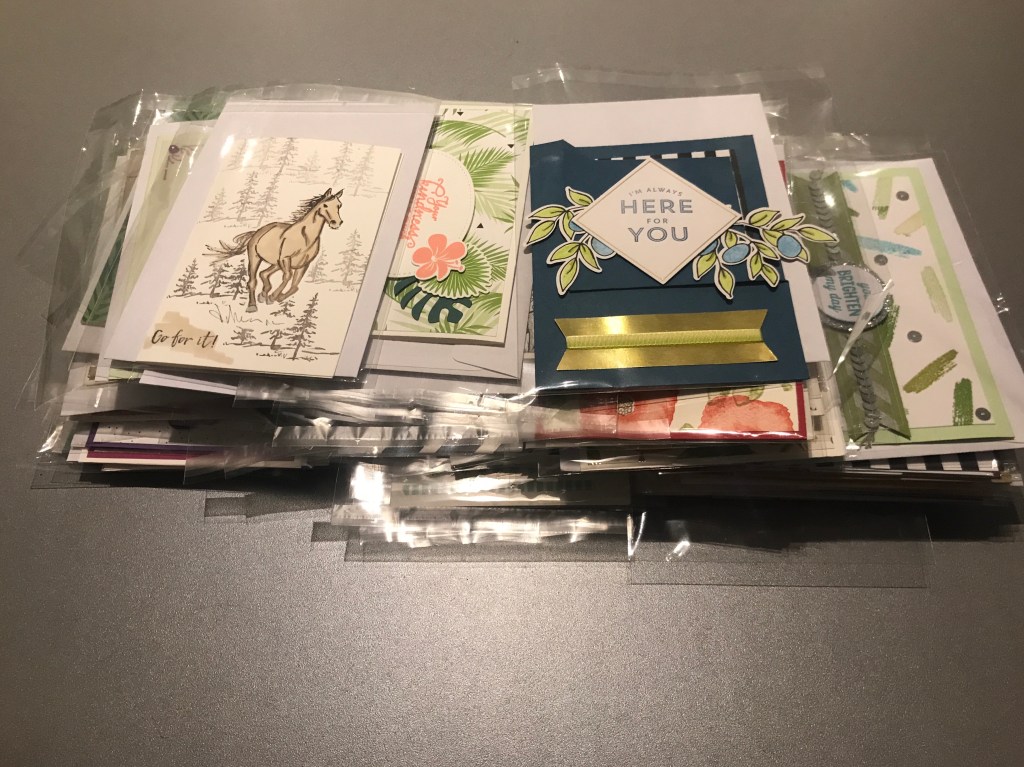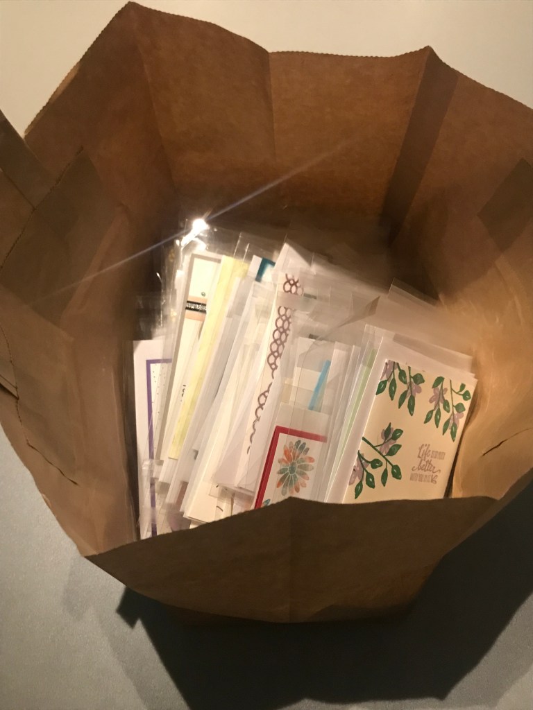 Zoals jullie waarschijnlijk wel weten verkoop ik ook kaarten. De kaarten in mijn rek kosten € 3,00 per stuk. Kaarten die in opdracht gemaakt worden kosten € 3,50. Maar gisteren kreeg ik via mijn vriendin een verzoek om kaarten te doneren aan zorggroep Archipel Best. En toen dacht ik: ipv steeds 3 kaartjes per dag te versturen en zo 3 mensen blij te maken, heb ik nu de kans heel veel mensen blij te maken. Dus ik ben naar mijn rek gegaan en heb 100 kaarten in een tas gedaan om weg te geven. Ja je leest het goed: 100!