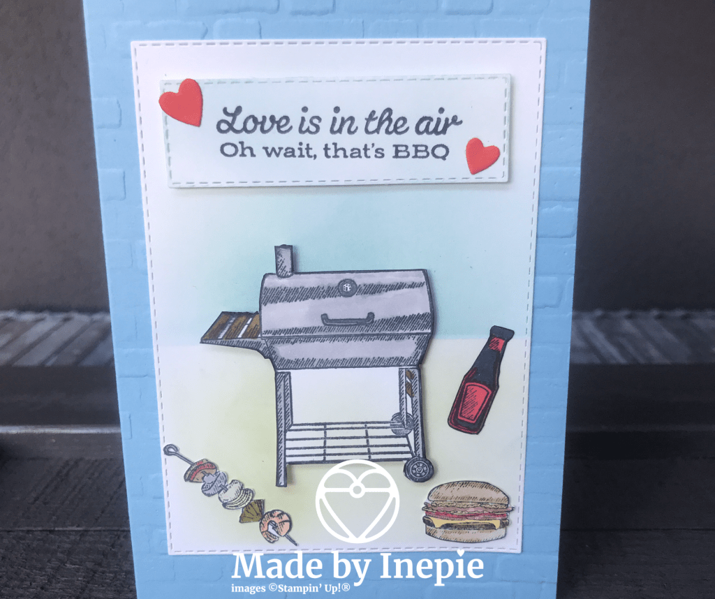 Ik heb eerst een achtergrond gesponst met Balmy Blue en Granny Apple Green inkt op een stuk Whisper White cardstock. Daaruit toen een rechthoek met de Rectangle Stitched Dies gestanst en daar de bbq met dimensionals opgeplakt. De tekst op een reststuk Whisper white gestempeld met memento inkt en uitgestanst met een kleinere rechthoek. Ik vond dat te wit dus heb ik met een sponsje Balmy Blue inkt toegevoegd. En daarna de tekst ook opgeplakt met dimensionals. En toen puzzelen wat ik erop wilde en waar.