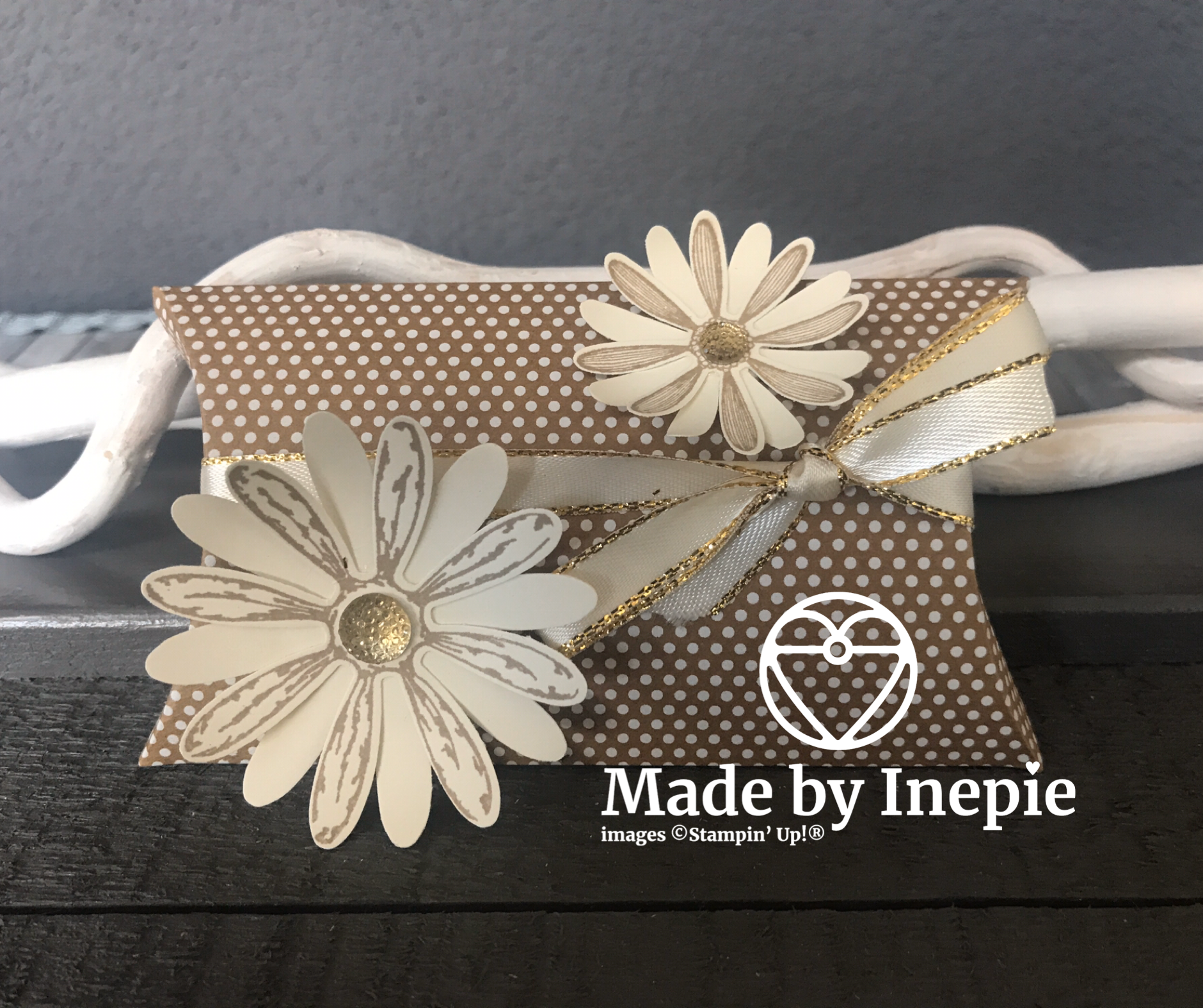 De basis is de Stampin’ Up Kraft pillowbox wat je zo bij mij kunt bestellen. Er omheen heb ik het mooie Gold Mettalic Edge Lint gedaan. Toen met de twee Daisy ponsen en de bijbehorende stempelsets de margrietjes gemaakt. Ik gebruikte Very Vanilla cardstock en Crumb Cake inkt. De 2 bloemen met tombow op elkaar geplakt ( 1 gestempelde en 1 ongestempelde) en met een dimensional op het doosje geplakt. De hartjes zijn de goudkleurige faceted gems. Schattig doosje toch en de desinfecterende handgel komt nu goed van pas. Mijn vriendinnen waren er weer blij mee.