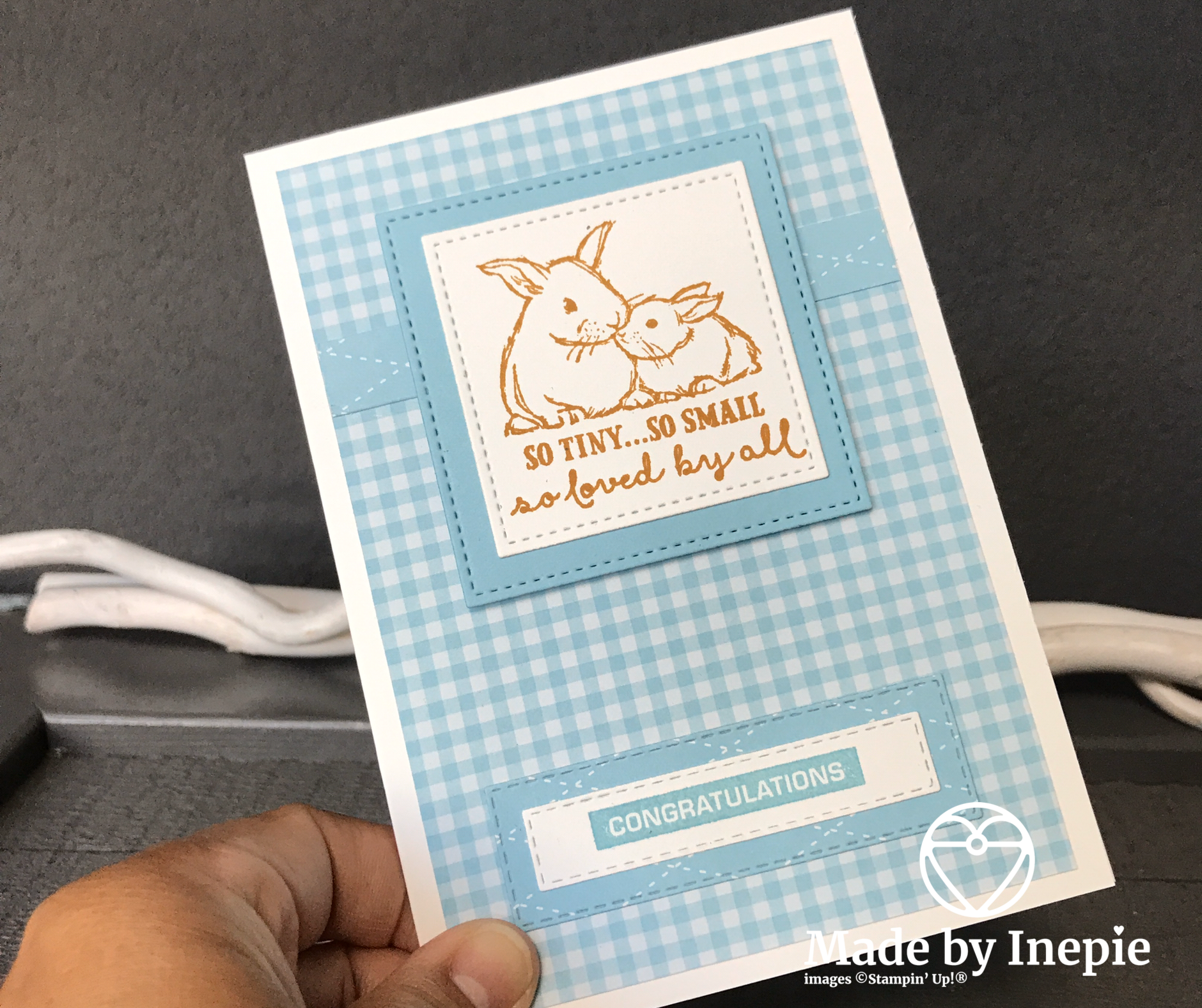 Schattig zijn die konijntjes toch uit de set: Wildly Happy. En ook de tekst komt uit deze mooie set. De tekst congratulatiobs komt uit de Label Me Bold set. Vanavond weet ik dus of deze sets nog blijven of helaas moeten gaan. Gelukkig gaat de nieuwe catalogus pas in juni in dus heb ik nog een paar maanden om met de retired sets te spelen.