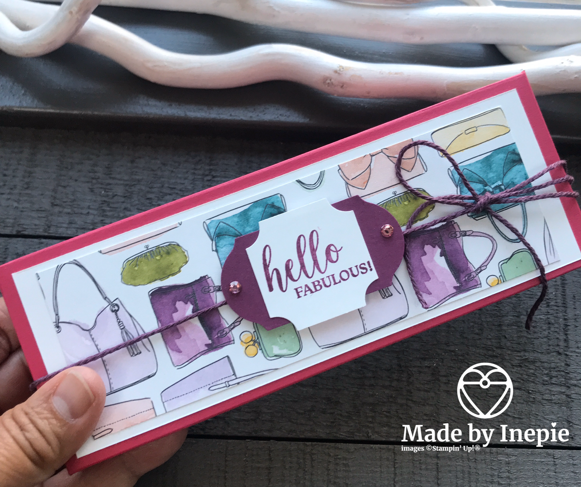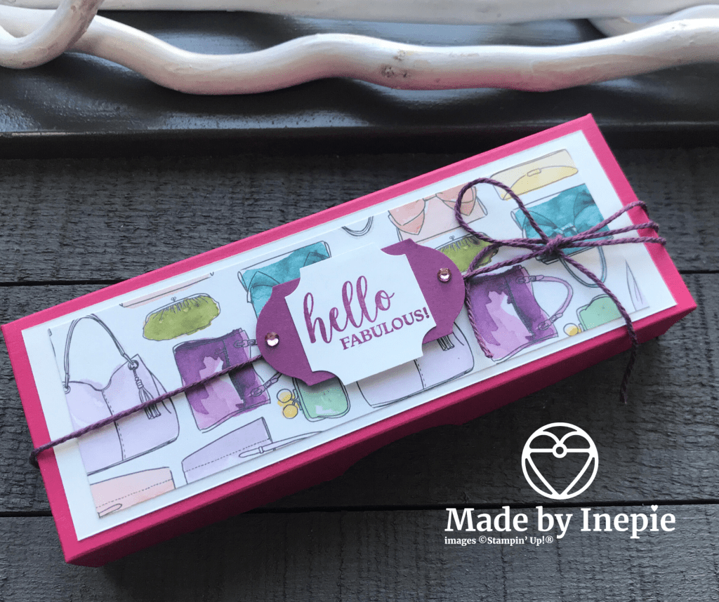 Mijn doosje heb ik gemaakt met een basis van Lovely Lipstick cardstock. Met een mat erop van Whisper White cardstock en een stuk Best Dressed Dsp. De tekst komt uit de Dressed to Impress stempelset en heb ik in Rich Razzleberry inkt gestempeld op een reststukje Whisper White. Dit heb ik uitgeponst met de Darling Label Punch en opgeplakt op een stukje Rich Razzleberry die ik heb uitgeponst met de Timeless Label pons. Het bakers Twine komt uit de Nature’s Twine combo in de kleur Blackberry Bliss.