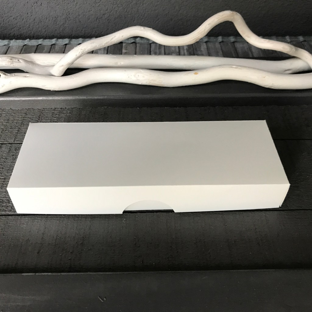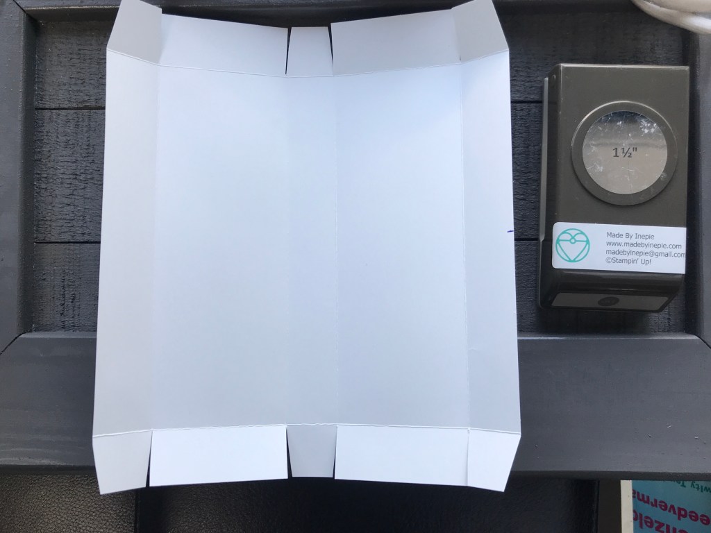 Je rilt op de lange zijde op 1”en op 8”. Dan draai je het papier een kwartslag met de korte kant boven en rilt op: 1” , 3 1/2”, 4 1/2” en 7”. En dat was het easy peasy. Vouw alles goed met een vouwbeen knip de kleine flapjes in tot de eerste vouwlijn. Knip ze iets schuin af. Pak een cirkel pons ik heb de 1 1/2” genomen maar mag ook kleiner of groter en pons een halve cirkel uit 1 lange kant dat wordt het deksel.