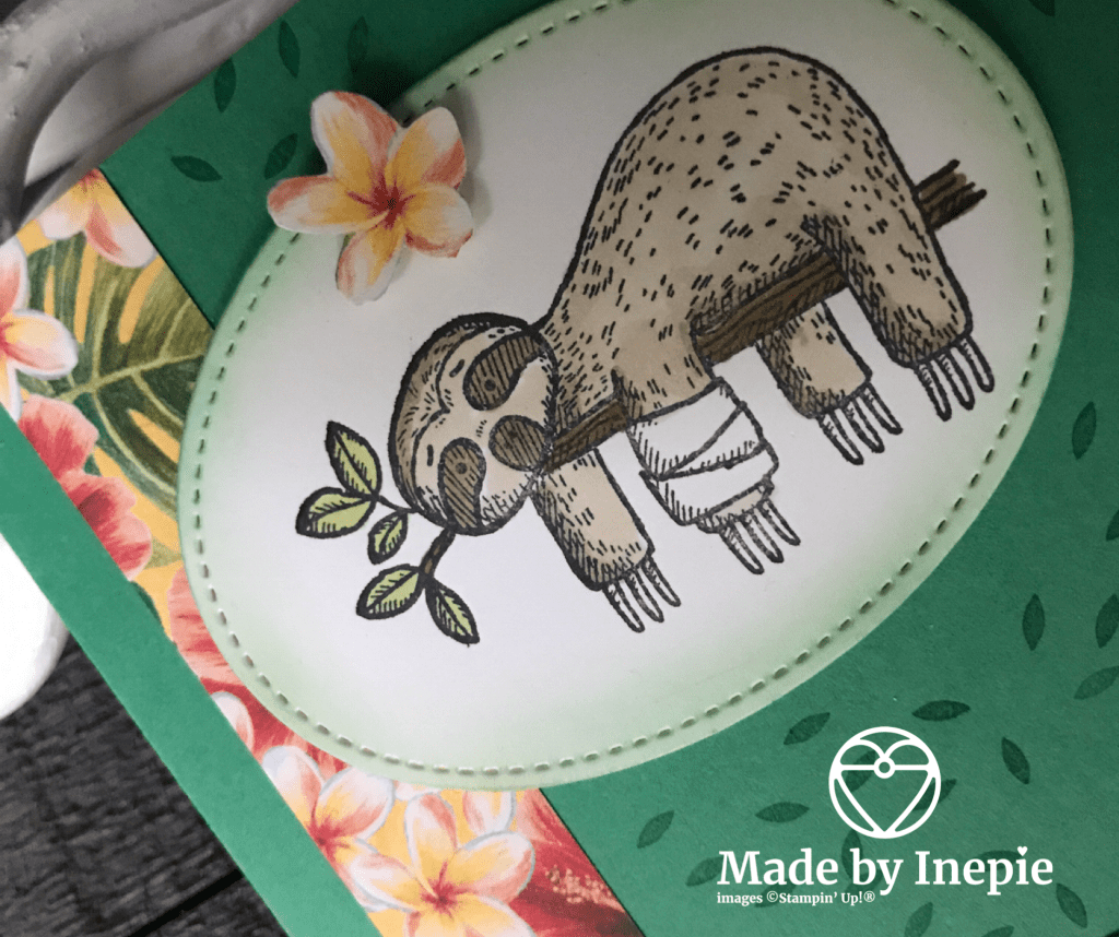 De luiaard heb ik met Tuxedo Black Memento inkt gestempeld op een stukje Whisper white en daarna ingekleurd met mijn Stampin’ Blends. Daarna de afbeelding uitgestanst met de grote ovaal van de Stitched Shapes Dies. Ik vond het zo te wit dus de rand gesponst met Call Me Clover inkt.