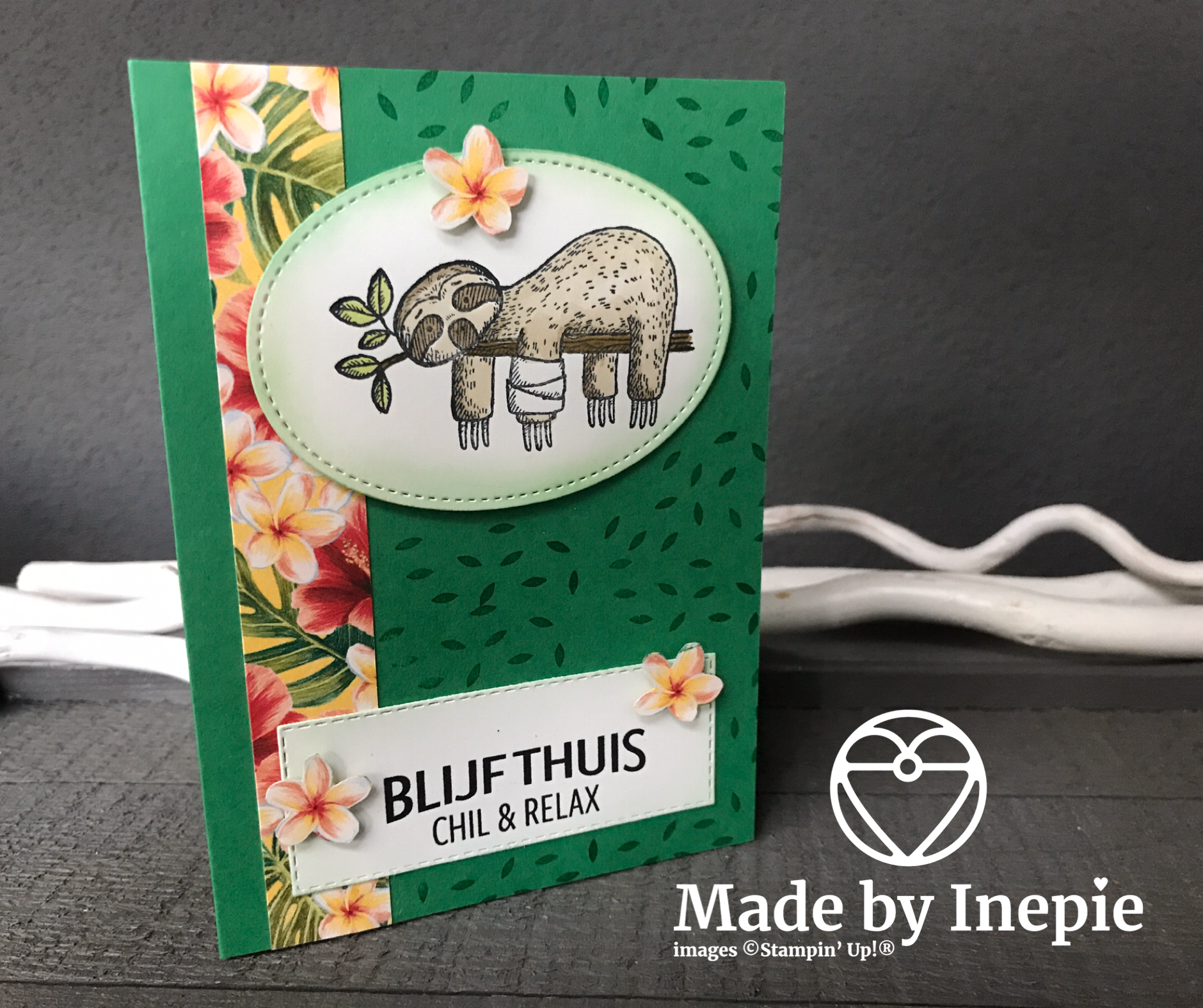 Vandaag weer een kaartje met de #sharesunshine Pdf. Ik wist meteen dat ik de luiaard bij deze tekst wilde gebruiken. De diertjes zijn zo leuk en gaan gelukkig mee naar de nieuwe catalogus. Tropical Chic waar ik de achtergrond mee heb gestempeld helaas niet. En ook mijn Call me Clover cardstock gaat er uit want die hoort bij de incolors 2018-2020. Maar we krijgen hele mooi kleuren er voor terug dus niet getreurd.