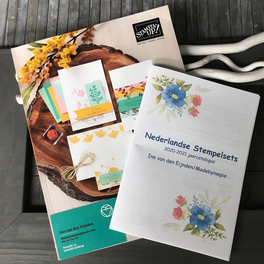 Over Nederlandse teksten gesproken, mocht je bij mij het afgelopen jaar een bestelling hebben geplaatst krijg je van mij de nieuwe catalogus thuis gestuurd plus een brochure waar alle 14(!) Nederlandse stempelsets in staan. De catalogussen moeten wij zelf betalen en daarom kan ik ze niet meer gratis aan iedereen weggeven want de Coronatijd heeft mij ook veel inkomsten gekost omdat mijn maandelijkse Koffie en Kaart middagen, mijn workshops en Kaartenbuffets niet door konden gaan. Doe je bij mij een bestelling van minimaal € 25,00 dan krijg jij de brochures ook gratis thuis gestuurd. Wil je (nog) geen bestelling doen dan betaal je € 5,95 voor de catalogussen inclusief verzendkosten. Doe je hierna toch een bestelling van € 25,00 of meer dan trek ik die € 5,95 er weer vanaf. Graag even mailen of je een catalogus wilt ontvangen op madebyinepie@gmail.com