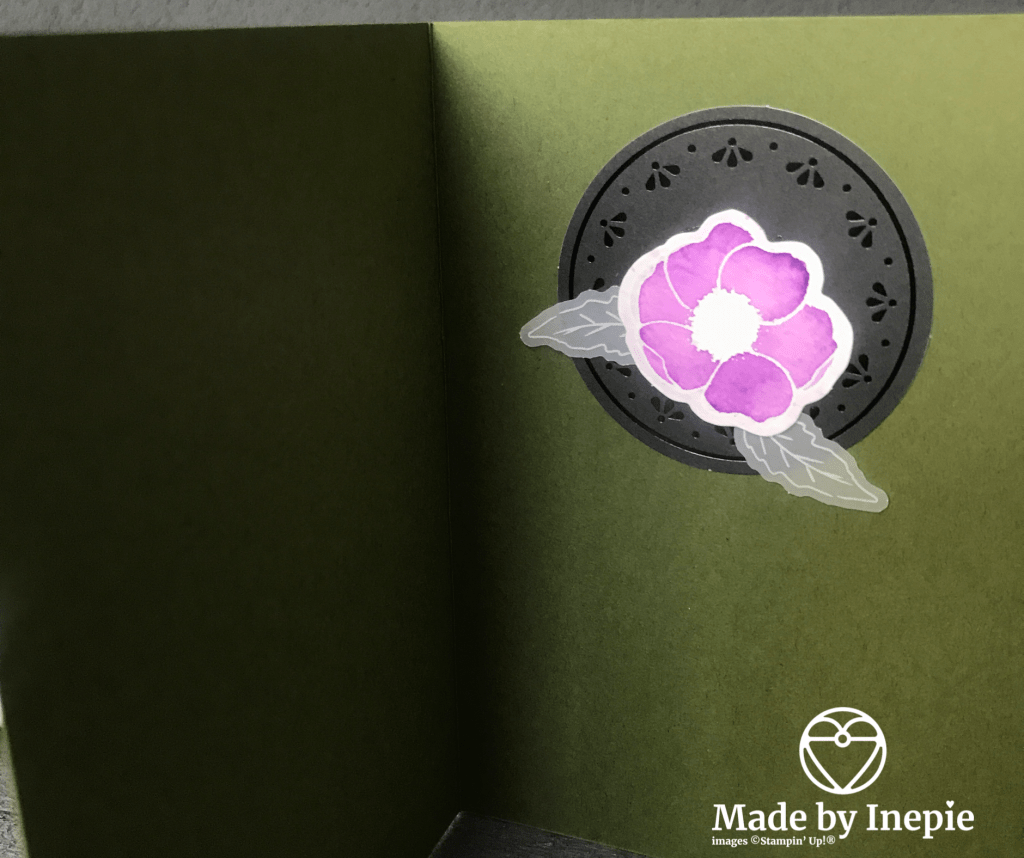 Op dit kaartje zie je de vellum blaadjes en de watercolor papieren bloem die ik met Blackberry Bliss en Rich Razzleberry inkt en mijn aqua painter heb ingekleurd. De tekst is uit de #Sharesunshine PDF.