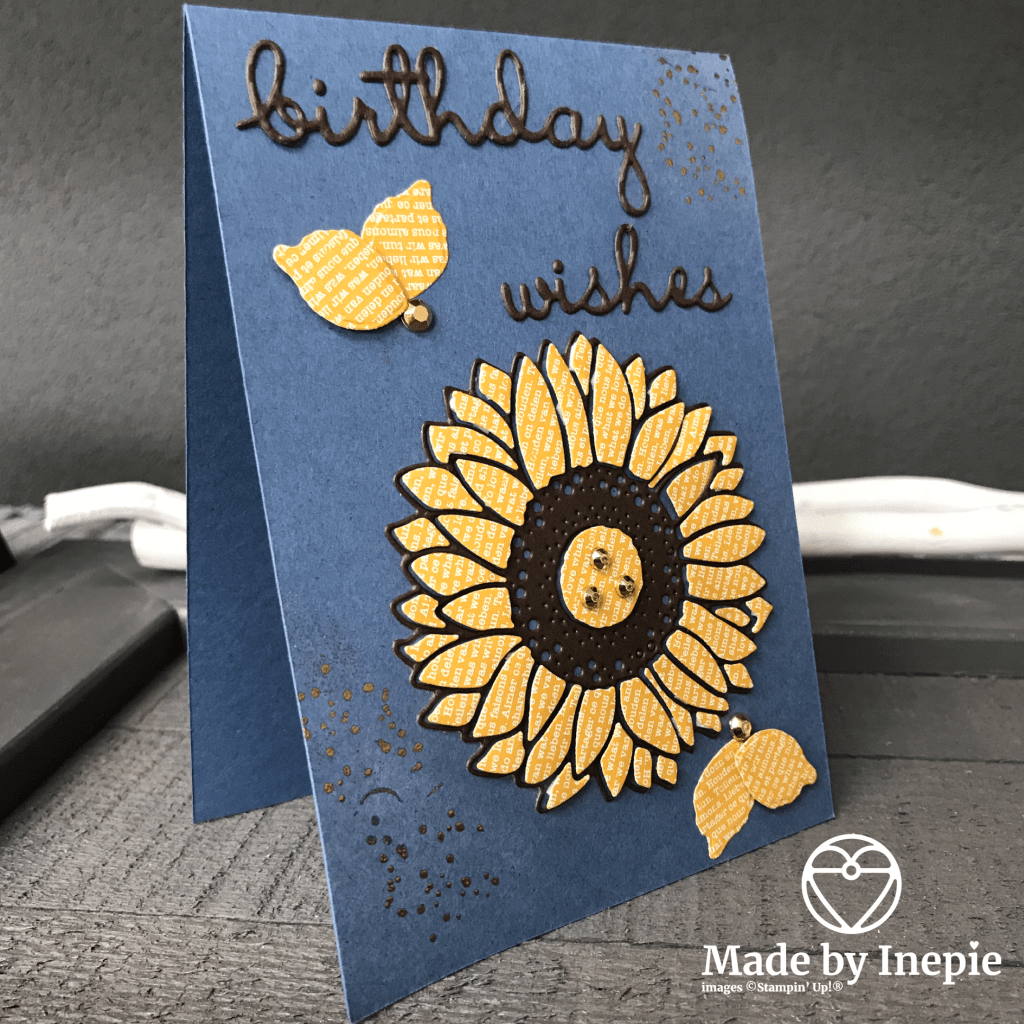 Vanochtend zag ik een berichtje van Kylie Bertucci. Een hele lieve en grote Demo in Australie. Zij had een hele leuke techniek: Paper Piecing Press and Seal technique. Je gebruikt hiervoor Press and Seal een plakkerig soort huishoudfolie uit Amerika. Ik heb deze gebruikt voor de Floating Frame technique en was dus blij om het nu weer te kunnen gebruiken. De Dies die Kylie gebruikte had ik niet maar ik heb de Sunflower Dies gebruikt. Je kunt met de press and Seal de stukjes op zijn plaats houden. Dan daar op mini-dimensionals doen en dan op de kaart plakken. De omlijsting heb ik in Early Espresso gedaan. Nu lijkt het net of ik ieder stukje er los heb ingepuzzeld maar dankzij de Press and Seal hoefde dat niet. Superleuk effect maar wel tijdrovend.