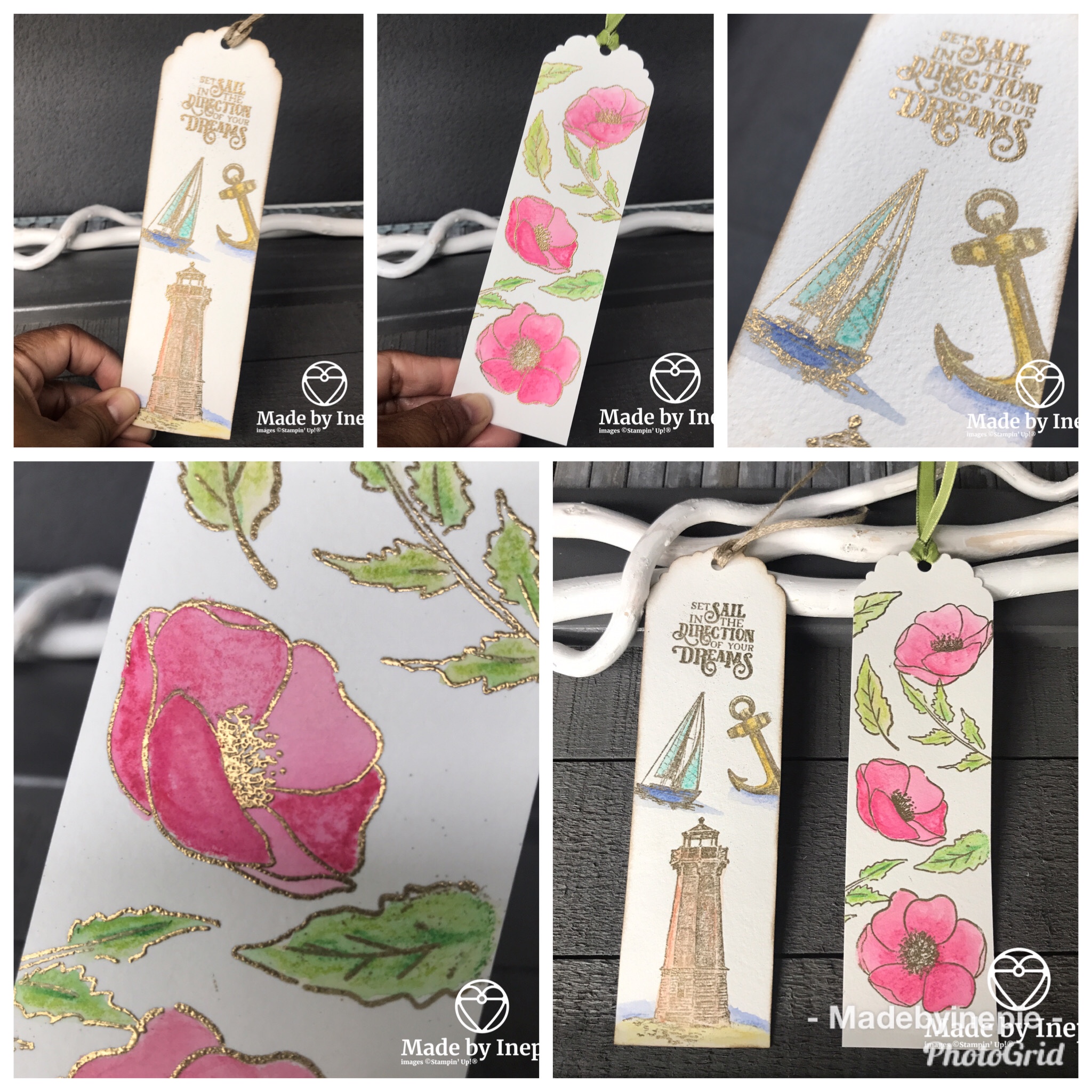 Ik heb 2 stroken gesneden van 2″ breed en deze met versamark bestempeld de ene met de Painted Poppies de ander met Sailing Home. Daarna bestrooid met Goud embossingpoeder en verhit met mijn Heat tool. Nu kon het rustgevende inkleuren beginnen. Met mijn watercolorpencils kleurde ik wat vlakjes ruw weg in en met mijn Aquapainter verfde ik de vlakjes dan vol.