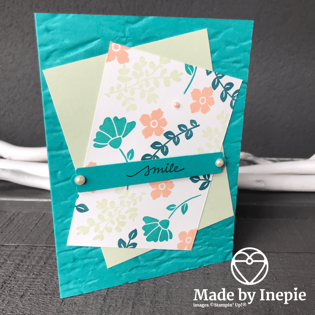 Omdat mijn grote bestelling uit de nieuwe catalogus nog niet binnen is ben ik maar door gegaan met de Lovely You set te spelen in combinatie met de Old World Paper 3 D embossing. Alleen een hele andere kleurcombinatie. Ik heb wel de soft Seafoam inktpad gebruikt die lag nog op mijn tafel. Daarbij heb ik mijn favoriete kleur Bermuda bay gepakt. Petal Pink voor het bloempje en Pretty Peacock om het donkere contrast te krijgen. Lekker uit de losse hand gestempeld op een stuk Whisper White. De basiskaart van Bermuda Bay door de embossing folder gehaald. Hierboven op speels een stuk Soft Seafoam cardstock en daarweer boven op het gestempelde stuk. Voor de tekst heb ik gekozen voor Smile en deze heb ik met de Lovely Labels Pick A Punch uitgeponst. Voor de Bling Bling basic parels gekleurd met mijn dark Petal Pink Stampin Blends en mijn kaartje was klaar.