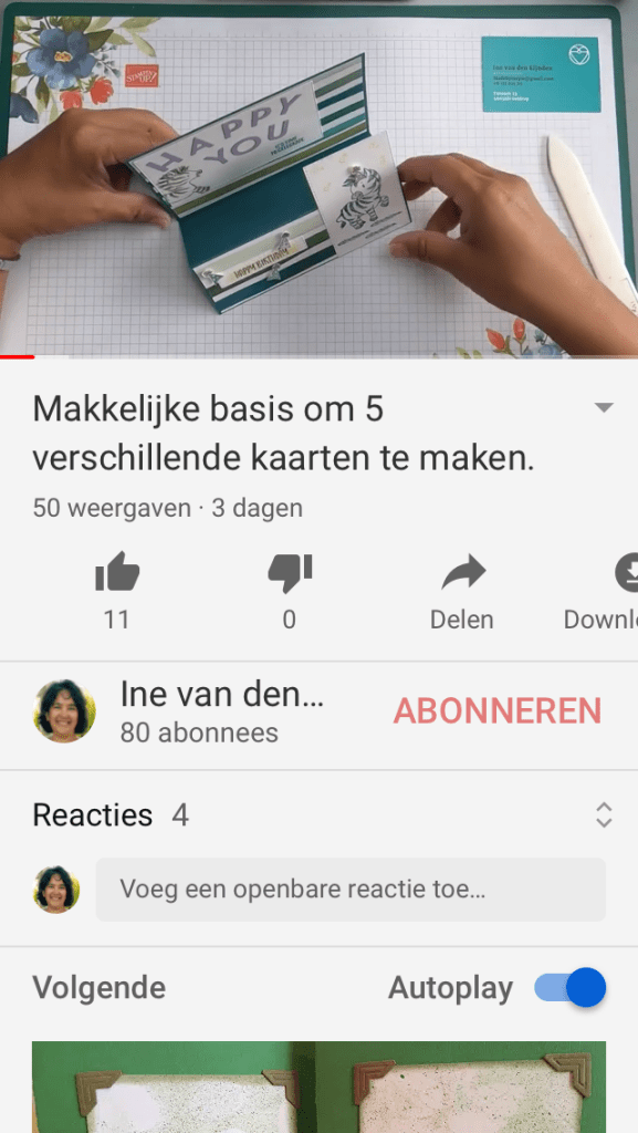 Heb je mijn filmpje nog niet bekeken raad ik dat echt aan want op een simpele manier kun je zo 5 verschillende kaarten maken. Ik heb nu 80 abonnees en ik zou super blij zijn als dit er honderd worden. Ik kreeg al van 2 klanten foto’s van kaarten die ze dankzij mijn filmpje hebben gemaakt en dat maakt mij blij en trots want hier doe ik het voor. Ik vind het steeds een bevalling maar doe het toch om zo anderen te helpen.