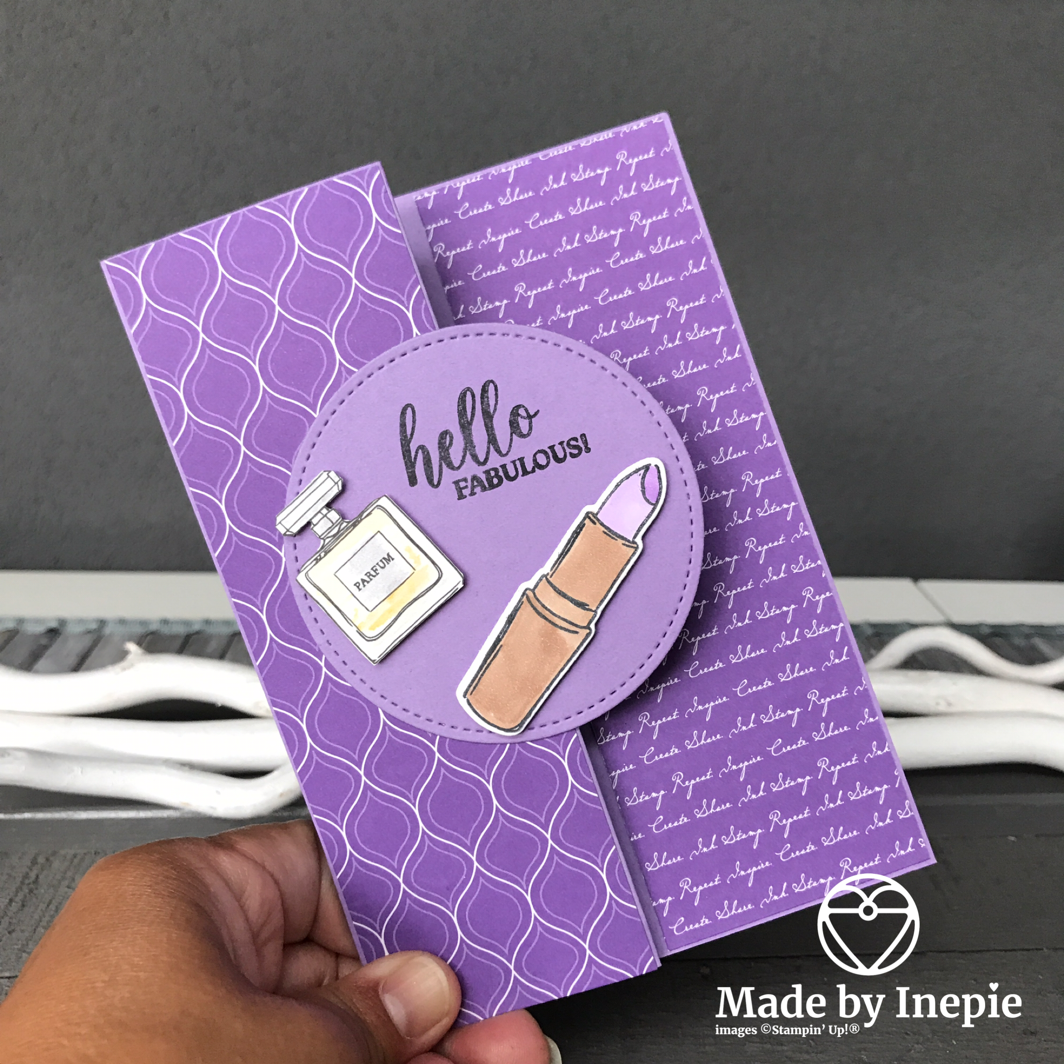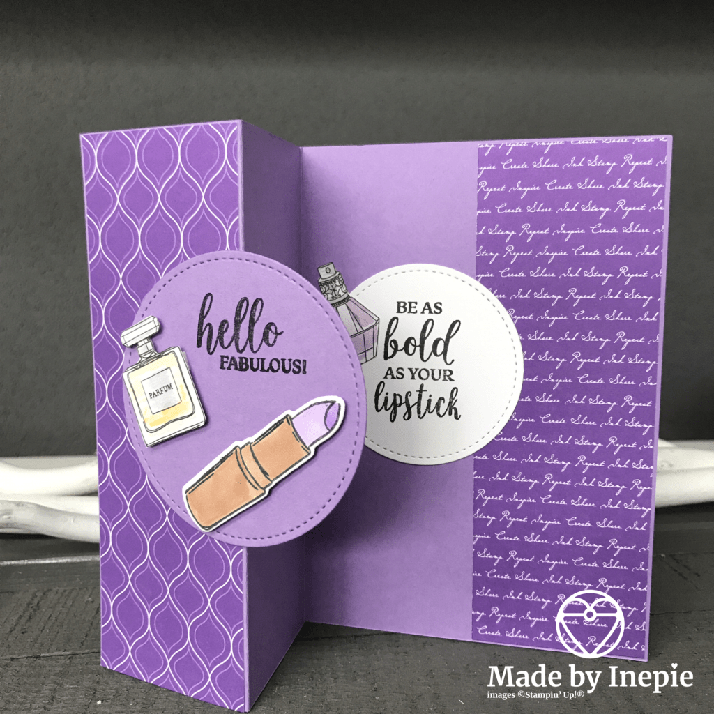 De basis kaart is in Highland Heather cardstock: door het midden vouwen en dan weer 1 keer naar het midden vouwen. De DSP panels erop plakken en ik heb met de Stitched Shapes Dies een Highland Heather cirkel en een Whisper White cirkel( 1 maat kleiner) uitgestanst. Teksten komen ook uit de Dressed To Impress set net als de lipstick die ik uitgestanst heb met de bijbehorende stansen. Ingekleurd met mijn Stampin’Blends en met Dimensionals opgeplakt. De twee parfumflesjes heb ik uitgeknipt uit het retired DSP papier.