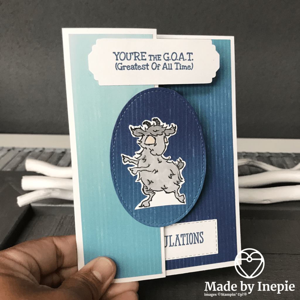 Dennis is een grote fan van Ronaldo (the Goat) dus toen deze stempelset in de catalogus kwam wist ik :deze moet ik hebben. Hij doet ook vaak grappige dansjes en daar vond ik de geit op de voorkant perfect bij passen.
