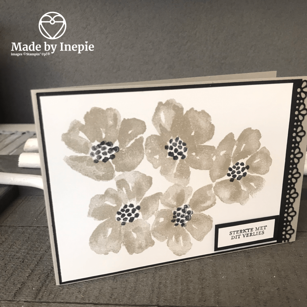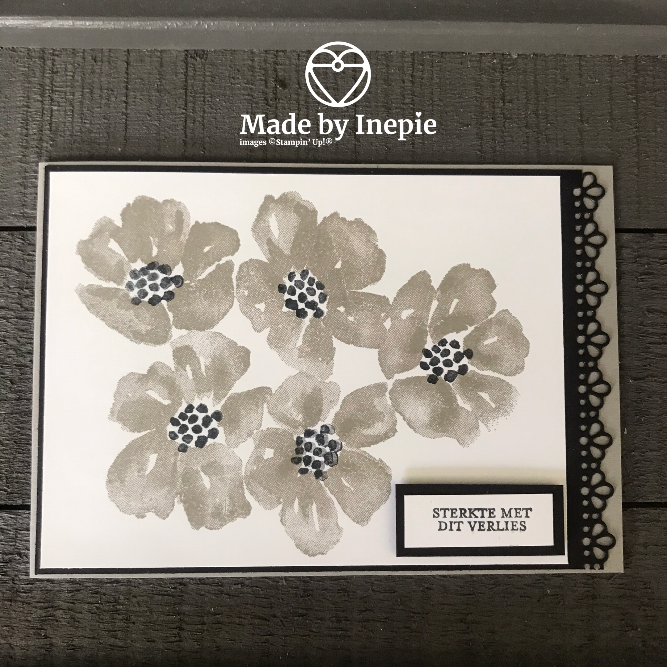Ik vind het een mooi kaartje geworden dat zeker troost zal bieden. Je ziet nu weer goed wat kleur doet. Ik ben zo blij met de Blossoms in Bloom. Jullie zullen die hier nog vaak voorbij zien komen.