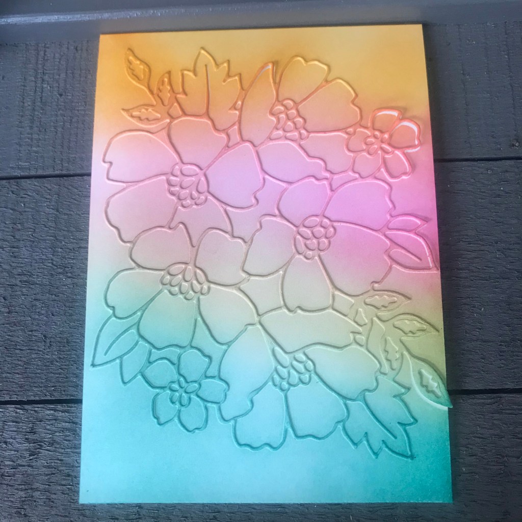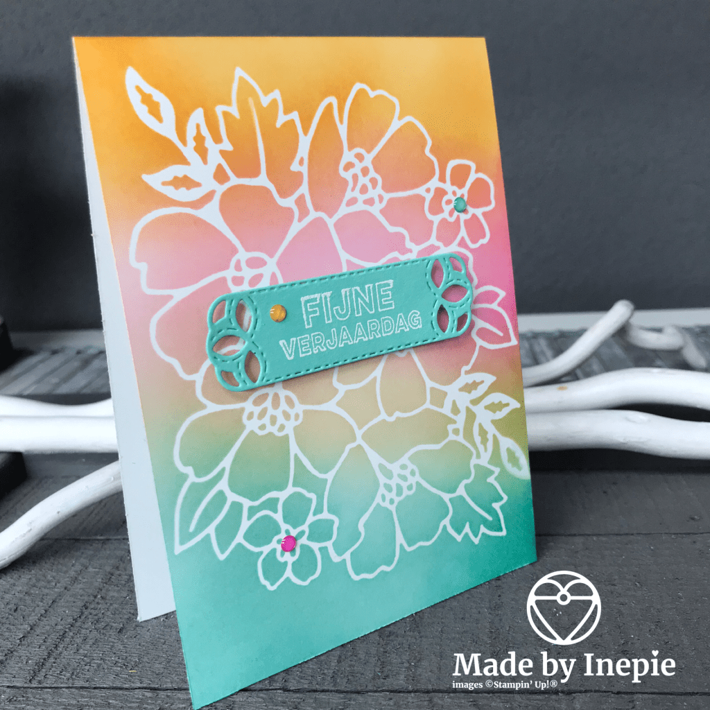 Vandaag heb ik dit mooie kaartje gemaakt met behulp van een stans. Ik heb de prachtige Many Layered Blossoms Dies gebruikt en wel de dunne omlijning stans. Deze heb ik op een stuk Whisper White gebruikt waar ik een stuk adhesive sheet achter geplakt heb. Dan creëer je een soort sticker. Deze sticker heb ik op een ander stuk Whisper White geplakt en toen met sponsjes kleur aangebracht:
