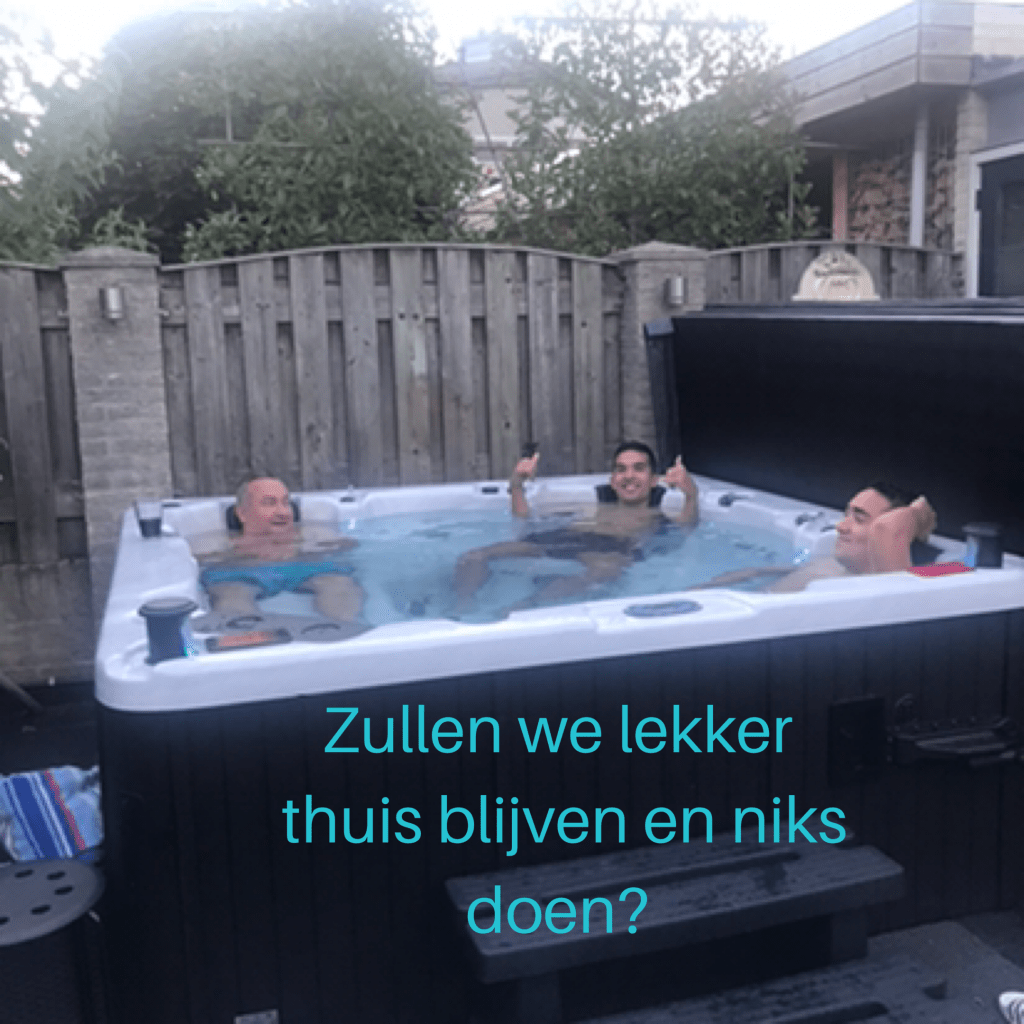 We gaan niet op vakantie dit jaar maar hebben ge-investeerd in een gezins cadeau: een Jacuzzi. Het schijnt heel goed te zijn voor mijn gewrichten en de boys en Willem vinden het ook helemaal geweldig.