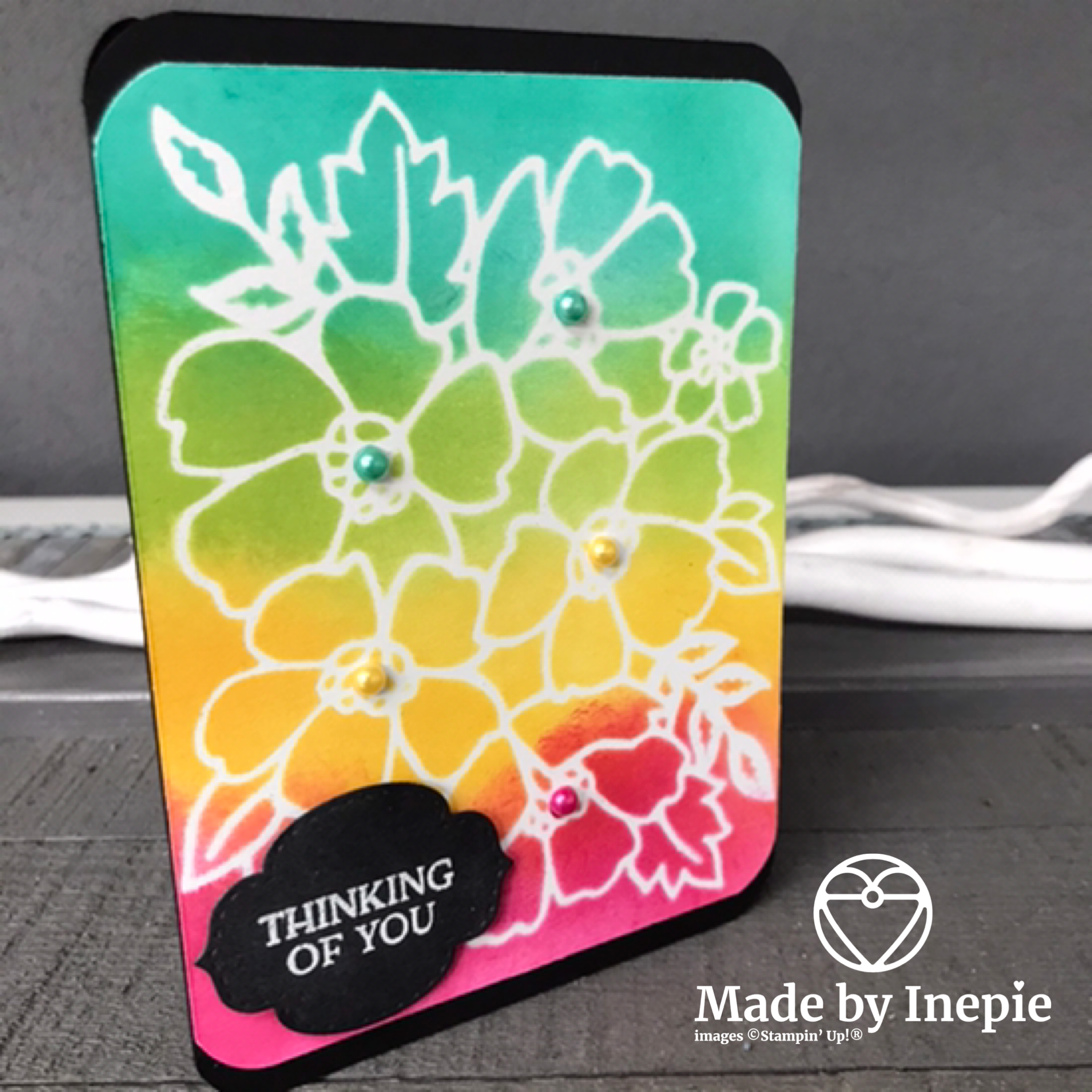 Van de andere mat heb ik de hoeken afgerond en ook van de zwarte basiskaart waar ik de mat heb opgeplakt. Met mijn Stampin Blends in Bermuda Bay, Mango Melody en Lovely Lipstick heb ik Basic Pearls gekleurd en in het hart van de bloemen geplakt. De tekst wederom ge-heat embossed en uitgestanst met een stans uit de Stitched So Sweetly Dies.