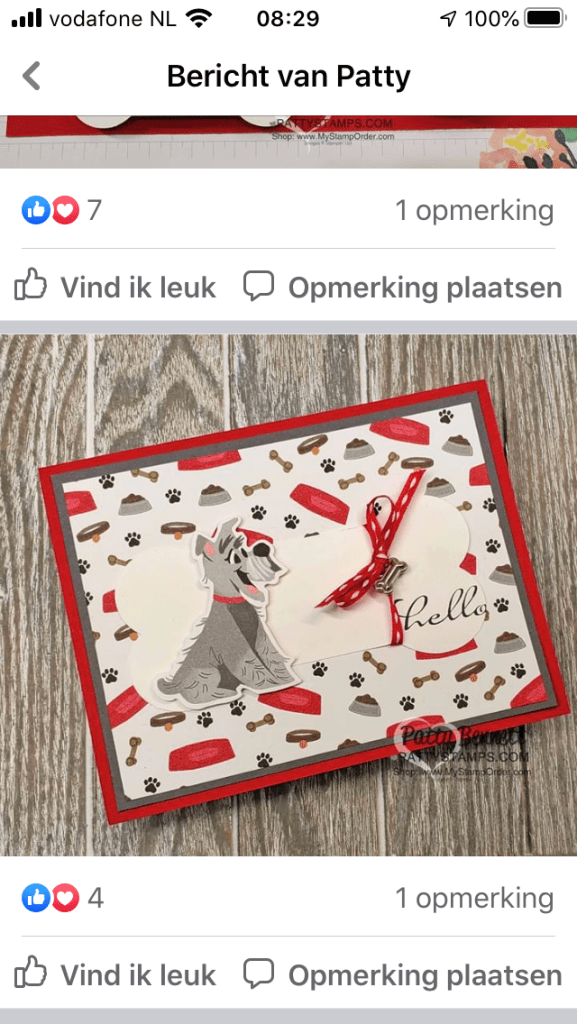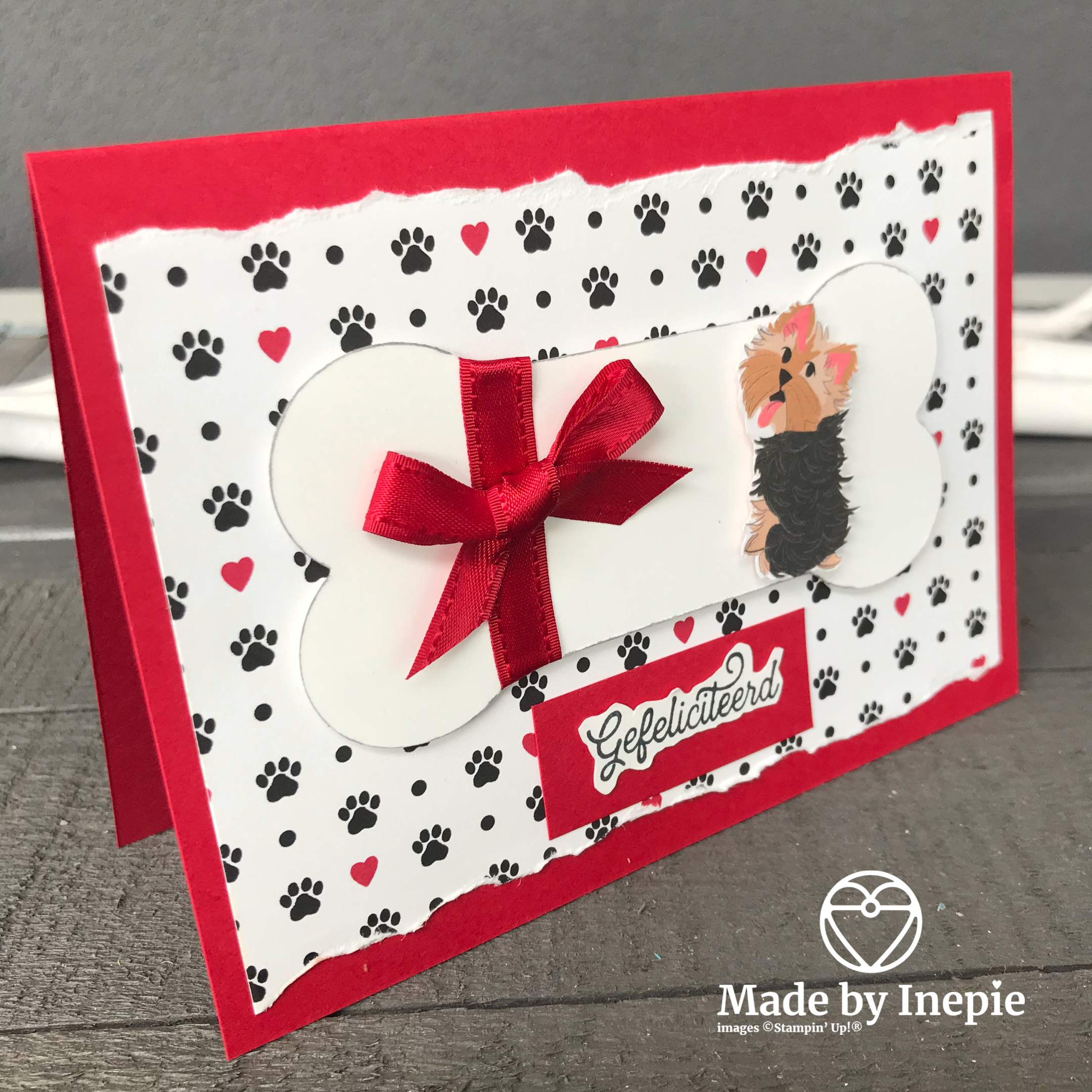 Het bot heb ik gemaakt van Whisper White cardstock: 2 hartjes en het stukje van 4 cm bij 5,5 cm. Op de ene naad heb ik het kleine hondje met dimensionals geplakt het hondje heb ik uit het Dsp geknipt met mijn Paper Snips. Op de andere naad heb ik een stukje Real Red satijnen lint geplakt Dit heb ik met tear and tape opgeplakt. Een los strikje gemaakt en deze met een gluedot opgeplakt. Het bot heb ik met mijn Gray Granite Stampin’ Write marker wat omlijnd om hem beter uit te laten komen. En daarna met dimensionals op de Dsp mat geplakt. De tekst Gefeliciteerd komt uit de mooie Nederlandse set Volop Vrienden.