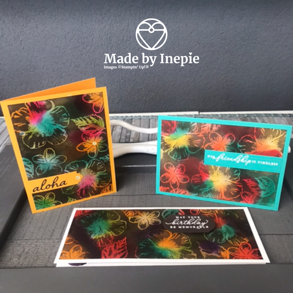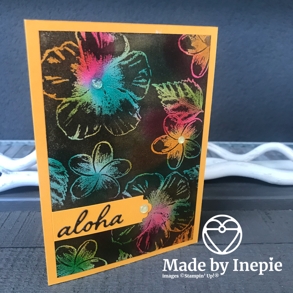 Ik ben superblij met de eindresultaten. Het kaartje uit de video heb ik naderhand afgemaakt door een strookje Mango Melody door de Lovely Labels Pick a Punch te halen. En daar bovenop de uitgestanste tekst Aloha uit de bijbehorende In The Tropics Dies te plakken. Om de focus op de prachtige bloemen te houden heb ik alleen nog wat Gold Glitter Enamel dots opgeplakt.