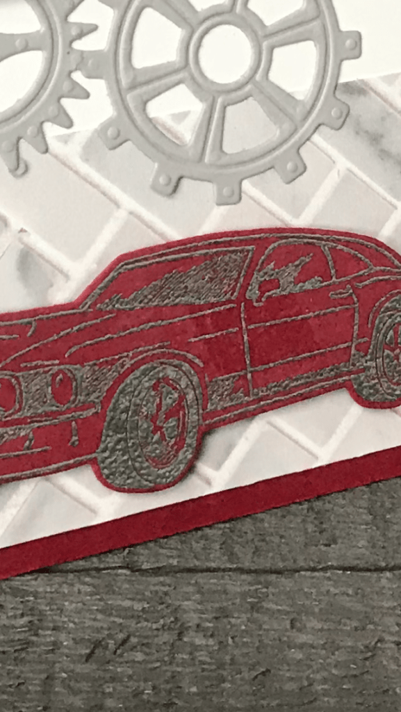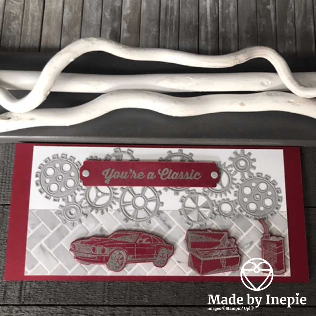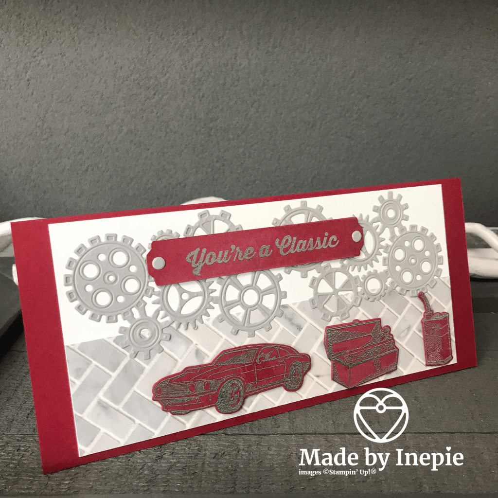 Onderaan heb ik een stuk In Good Taste Dsp geplakt en daar dus de raderen weer overheen geplakt. De auto, gereedschaps kist en oliekan heb ik met Versamark gestempeld op Real Red Cardstock en met zilver embossingpoeder bestrooid en verhit met de Heat Tool. Daarna ze met dimensionals opgeplakt.