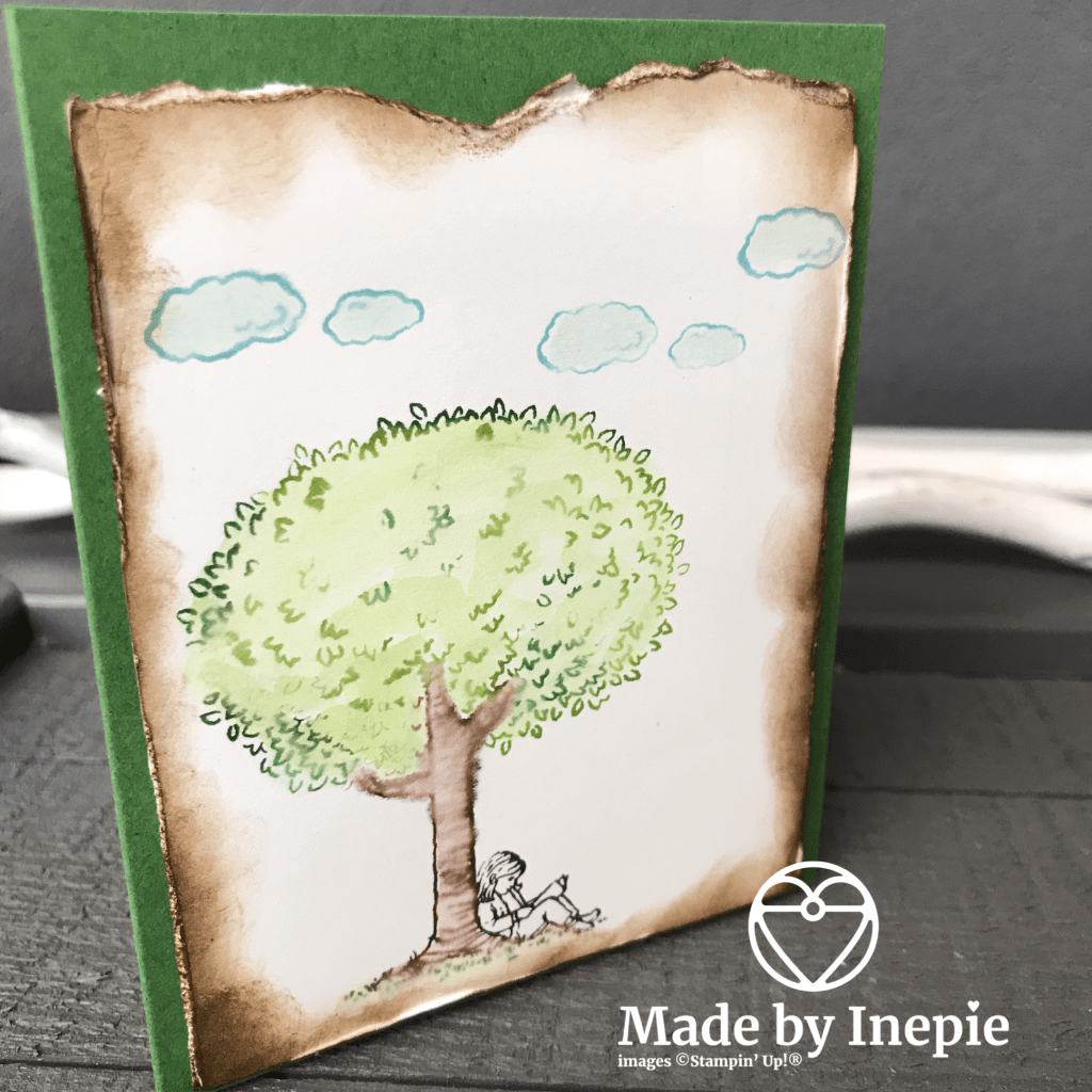 Dus dit is net een oude foto van mij zittend in de schaduw van een boom, verdiept in een boek. De randen van mijn whisper white heb ik boven gescheurd en aan de zijkanten ruw gemaakt met de beschermhoes van mijn Paper Snips. Je steekt je papier erin en haalt het hoesje op en neer langs de rand. Daarna gesponst met een Sponge Dauber en Soft Suede Inkt.