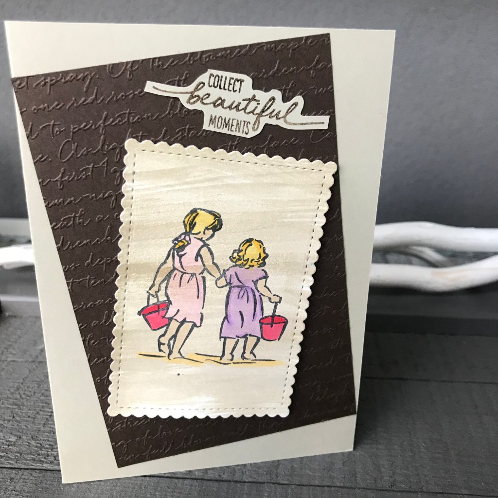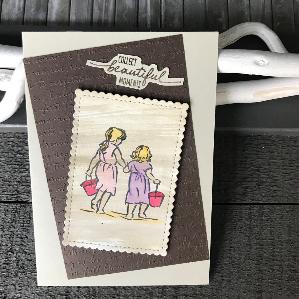 Met mijn Paper Trimmer heb ik de mat passend gesneden zodat ik het leuk schuin op de basiskaart van Sahara Sand kon plakken met mijn Stampin Seal. Daarna heb ik de stempelafdruk weer met de brede kwast en Sahara Sand inkt bewerkt. En deze uitgestanst met de Stitched so Sweetly Dies. Zo lijkt het net een oude foto.