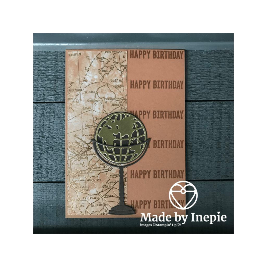 Deze stoere mannenkaart is eenvoudig te maken met de World Of Good Specialty Dsp, de World Map Dies en de Itty Bitty Birthdays stempelset.