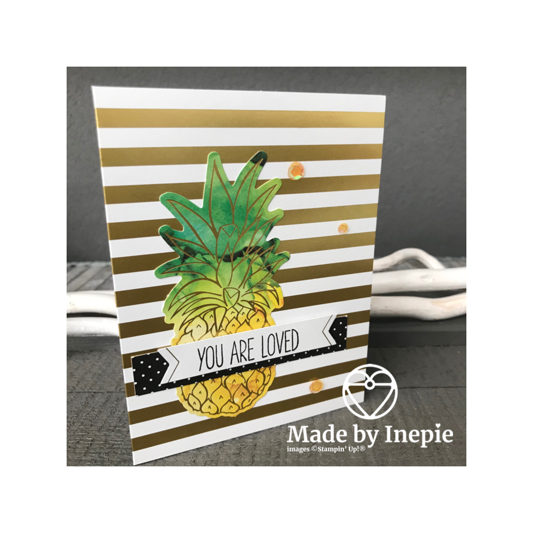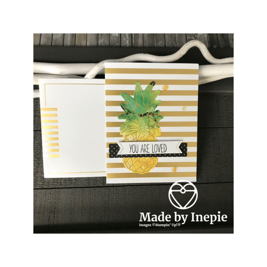 Vandaag het vierde voorbeeld kaartje uit de Paper Pumpkin box. Dit vind ik weer een geweldige kaart. Erg mooi met de gouden strepen. En die mooie ananas. Super eenvoudig om te maken.