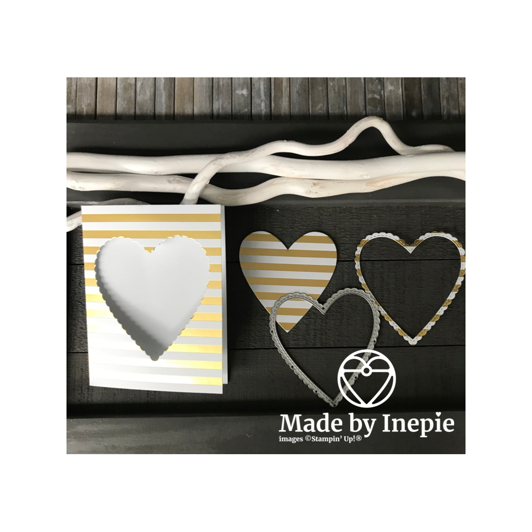 Hoe leuk is het om met 1 stans een hele andere kaart te maken. Deze hartstans uit de Be Mine Stitched Dies snijdt niet alleen een hart uit maar je krijgt ook een mooi open hart stansje wat ik hoogstwaarschijnlijk op het etiket van de doos ga gebruiken.