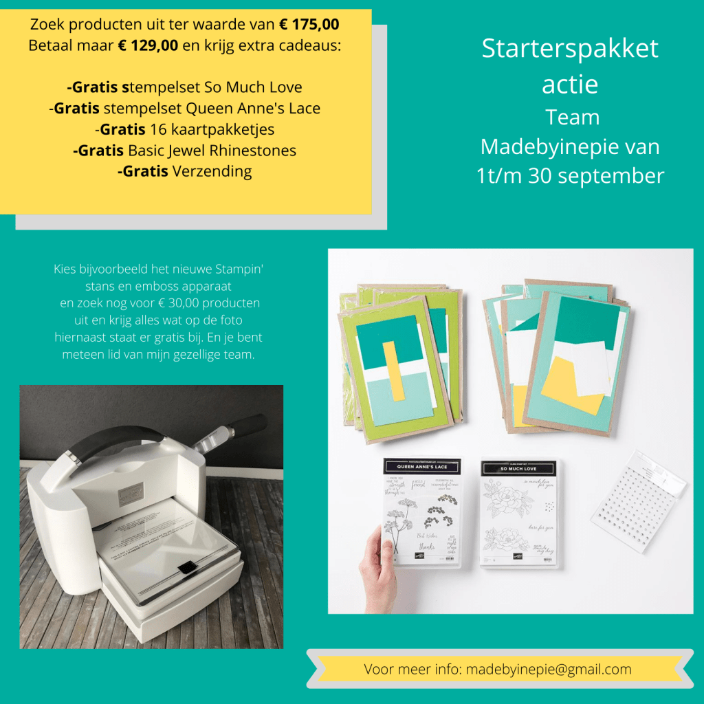 Het is nu 1 september en meteen het begin van een gave actie van Stampin’Up! Wil jij ook van je hobby je beroep maken? Stap dan in bij Team Madebyinepie. Je krijgt dan een leuke korting op je producten en kunt gaan werken aan een eigen team en klantenbestand. Om je meteen te helpen met je eerste workshop krijg je deze maand gratis producten bij het instappakket. Normaal mag je voor € 175,00 aan producten uitzoeken en betaal je slechts € 129,00. Nu krijg je er nog 2 stempelsets bij, rhinestones en 2 verschillende varianten kaartpakketjes waarmee je 8 kaarten ( in totaal dus 16) kunt maken. Het enige wat je nog nodig hebt is lijm,inkt, stempelblok, snij gereedschap of een schaar. Die kun je dan meteen uitzoeken voor die €175,00. En bevalt het je toch niet mag je alles gewoon houden en vervalt na 3 maanden je demoschap. Geen addertjes onder het gras. Ik ben 5 jaar geleden ook ingestapt voor de korting maar niet meer uitgestapt hihi. Ik heet jou graag van harte welkom in mijn team.