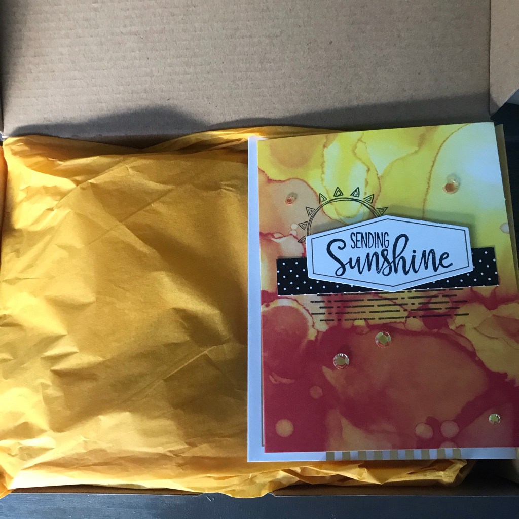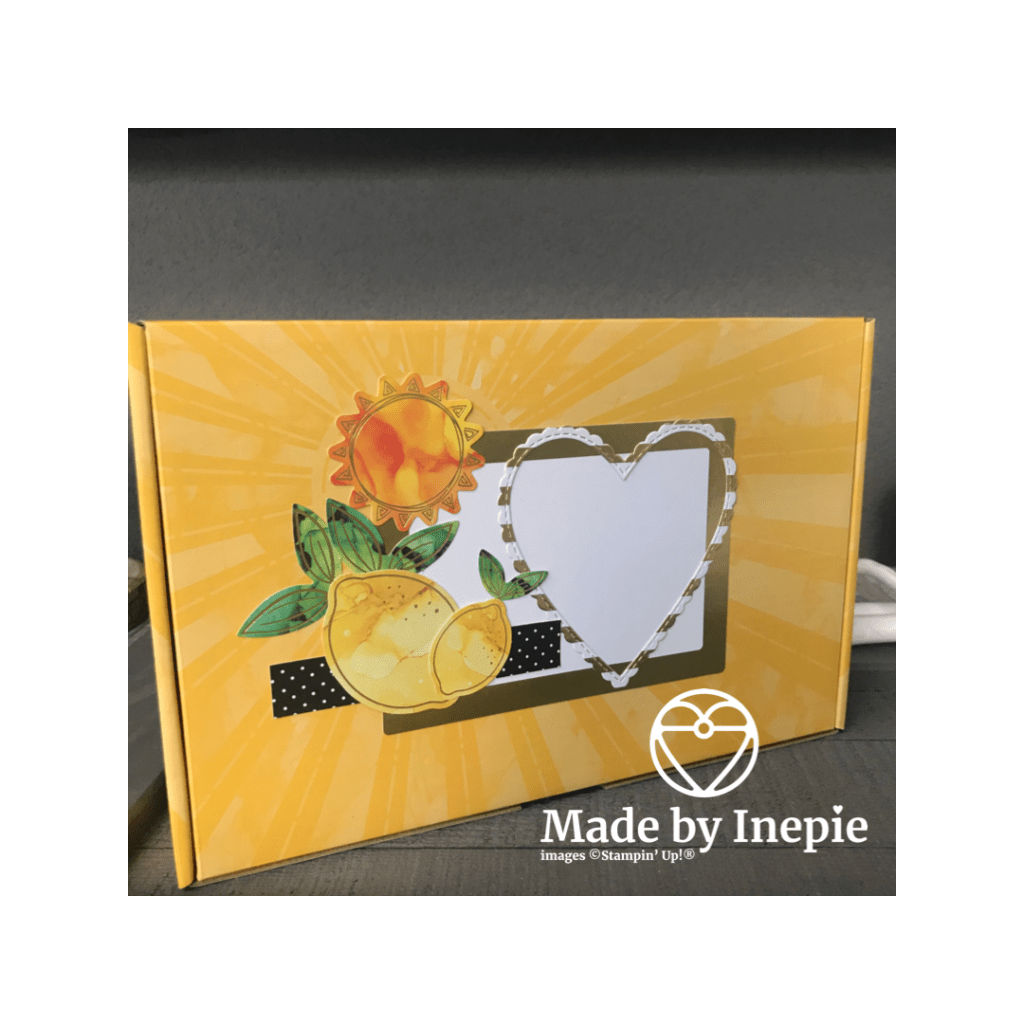 In het filmpje laat ik ook zien hoe je de doos ook nog kunt versieren met de etiket sticker. En ik wist toen nog niet wat ik er in zou doen maar ik heb even gekeken wat ik nog op voorraad had van gele producten en dit is het geworden: