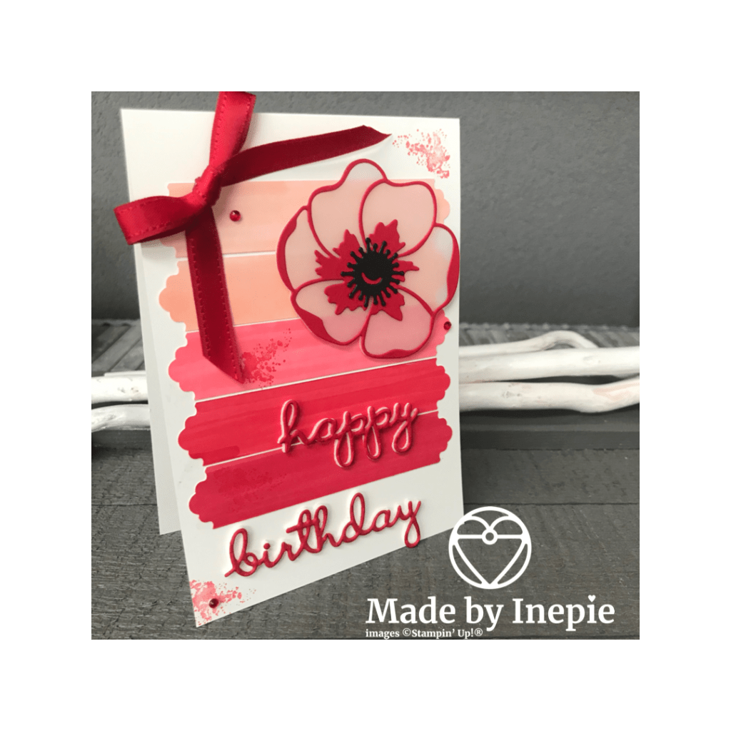 Dit model heb ik ge-cased van Cindy Schuster. Zij liet zien hoe leuk je een kleuren verloop met strookjes en blends kunt maken. Zij gebruikte de Beautiful World set en ik koos voor de Poppies. En mijn Lovely Labels Pick a Punch pons. Benieuwd voor welke kleuren en sets de dames maandag gaan.Fijn weekend.