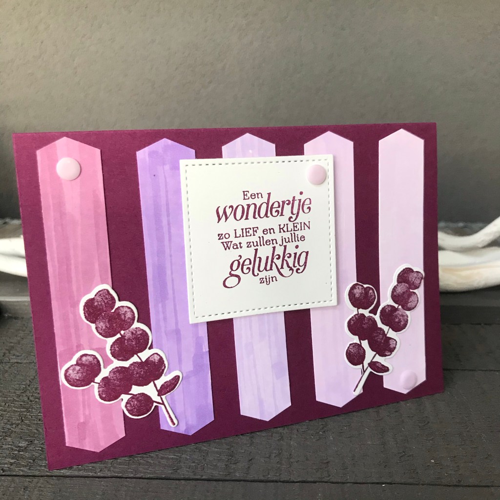 Ik had de strookjes kaarten als voorbeelden gemaakt en die vonden de dames erg leuk. Voor iedereen had ik 6 strookjes gesneden van 1,9 cm bij 10,5 cm. Deze mochten ze inkleuren met de Stampin’Blends. Ik heb mijn blends per kleur groep in mijn Stampin’ Blends Storage bakjes en de ene dame wilde blauw, de andere paars en de laatste wilde rood. Zulke leuke kaarten hebben ze gemaakt: ik was echt trots op hun.3 Totaal verschillende kaarten. Ook verschillende ponsen zijn gebruikt de Lovely Labels Pick a Punch en de Banners Pick a Punch. Deze zijn beide bij mij te bestellen op madebyinepie@gmail.com