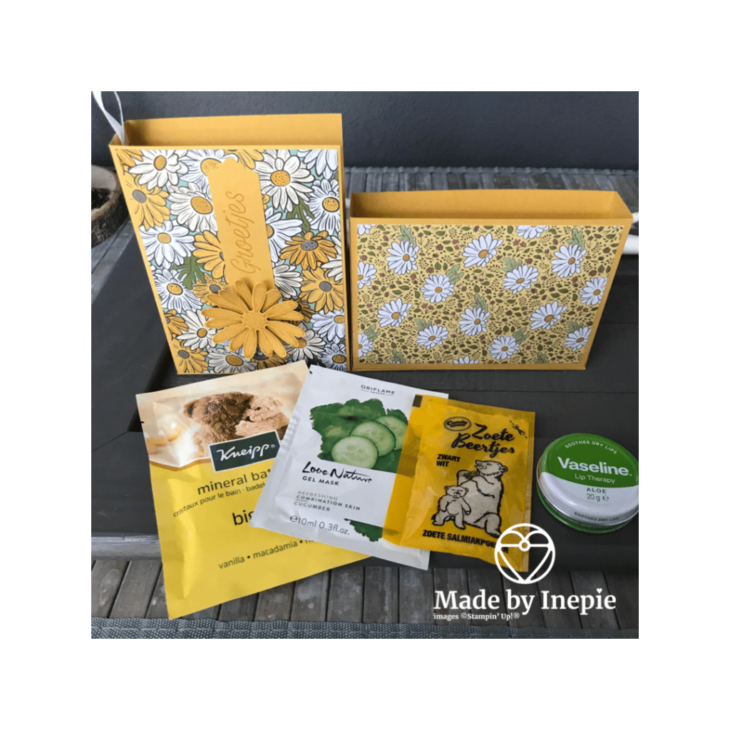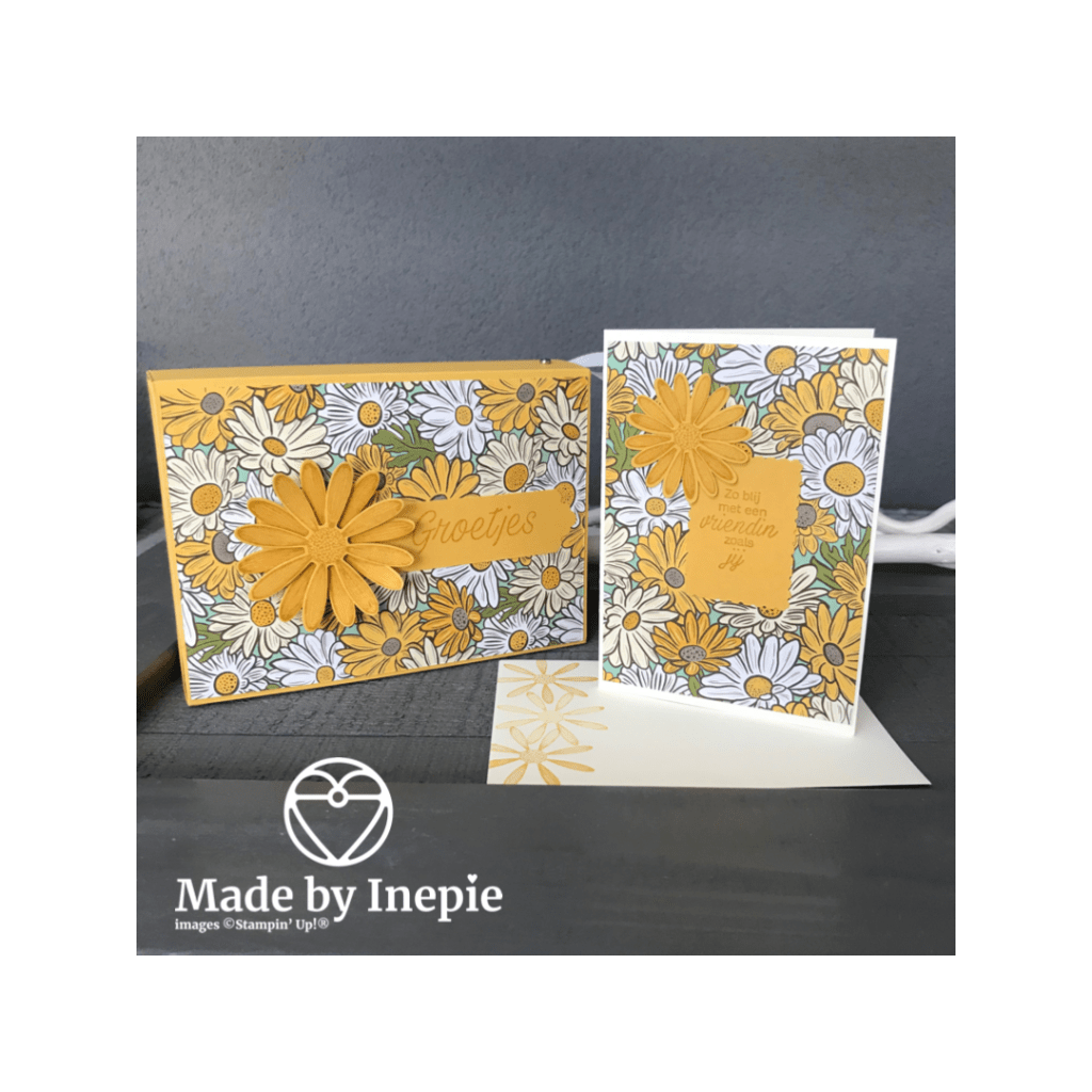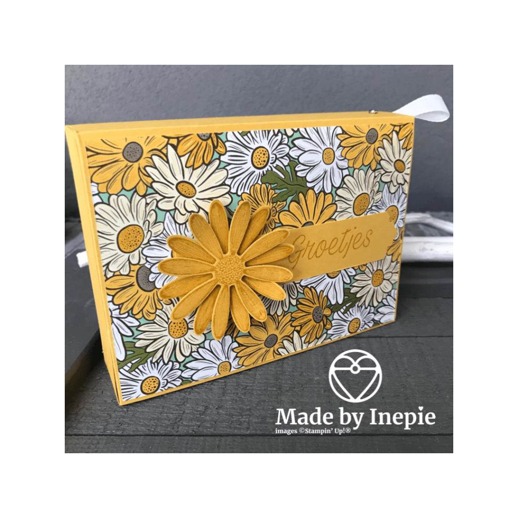 Ik heb er ook nog een bijpassende kaart bij gemaakt van de reststukjes. Ik heb de set Pluk de Dag gebruikt voor de kaart en de versiering van de doos en de bijpassende grote en medium Daisy ponsen. En de teksten heb ik gestempeld met Bumblebee inkt op Bumblebee cardstock. Daarbij heb ik de Lovely Labels Pick a Punch en de Rectangular Postage Stamp punch gebruikt om de teksten uit te ponsen.