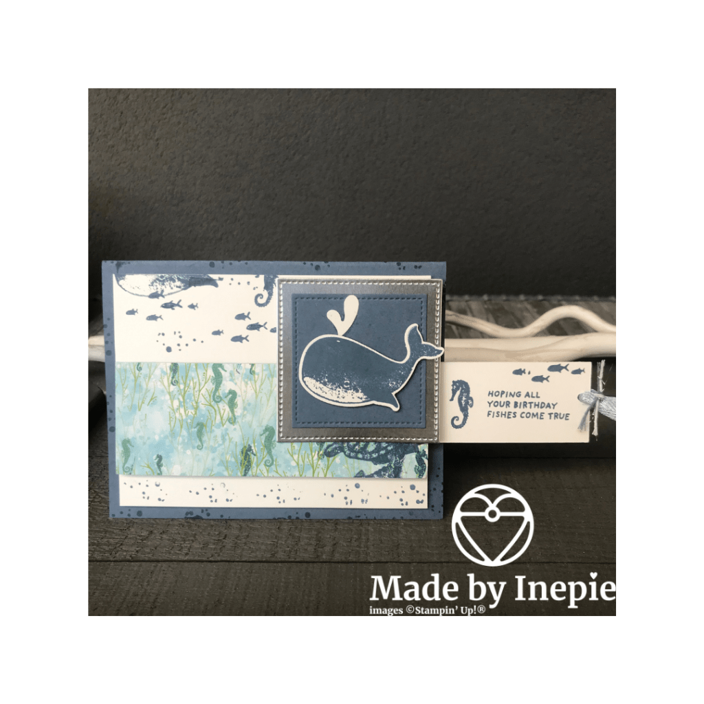 Zoals je ziet zit hier het mechanisme hoger: je ponst hier zover als het papier in je pons past. Dus hoef je geen potlood lijn te trekken. Ook de Story Label Punch hou je hier heel want er komt een groot element op. De stitched rectangle. Het Dsp is ook van deWhale of a Time Suit. Echt super leuk papier wat weinig nodig heeft. En de tekst komt uit de stempelset Whale Done. Ik heb de achtergrond zelf gestempeld vond het anders te wit.