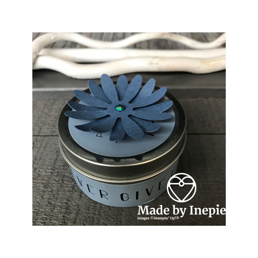 Van de week wilde ik gauw een cadeautje maken en ik had nog leuke blikjes met een kaarsje erin. Ik kocht ze voor de tekst die erop stond: Never give up on your dreams. Ik vond Misty Moonlight er mooi bij passen dus heb ik met de Daisy punch twee bloemen uitgeponst en op elkaar geplakt. En daarna op het blikje. Voor de Bling Bling heb ik zo’n mooie Blue Adhesive Backed Gem erop geplakt die vind ik zo mooi.