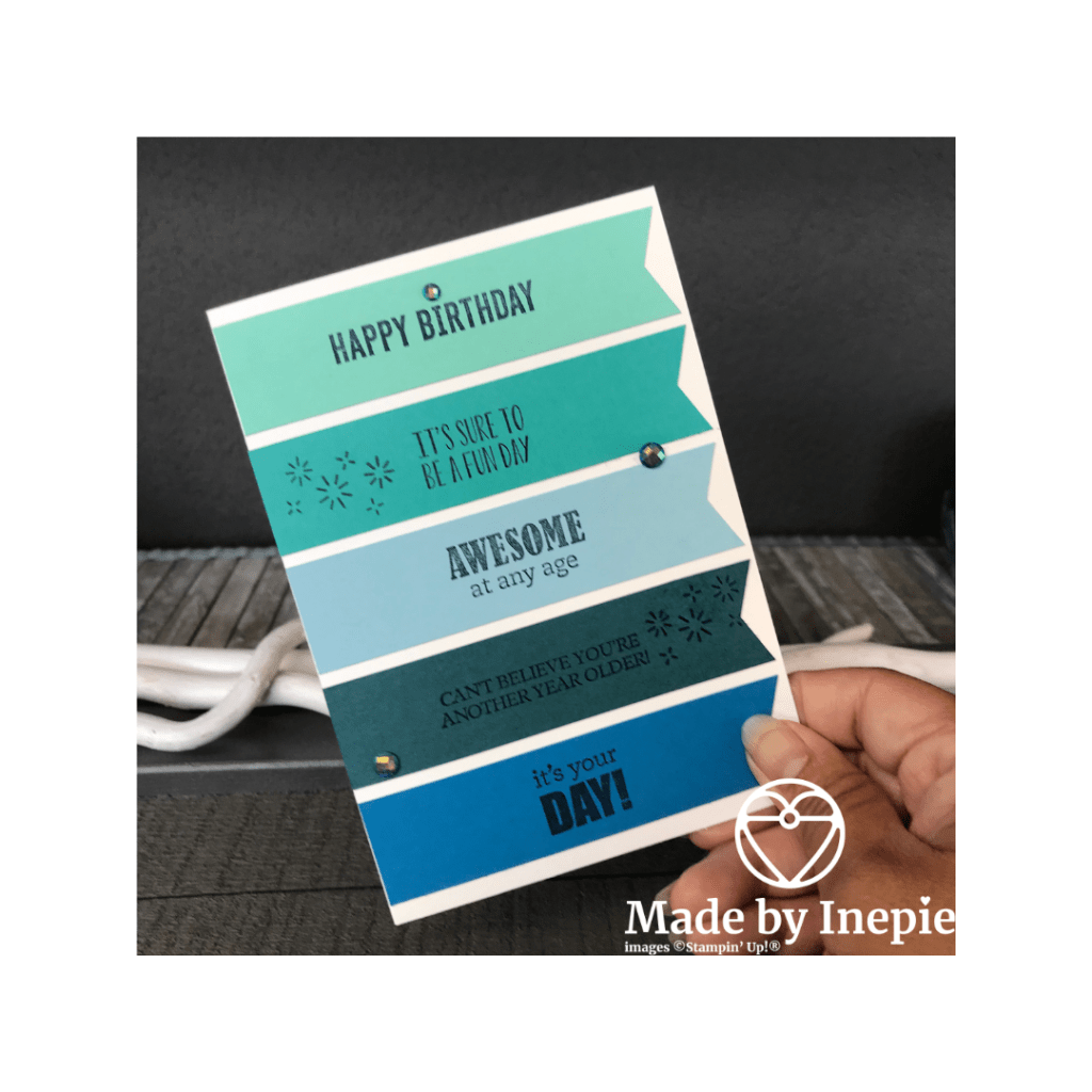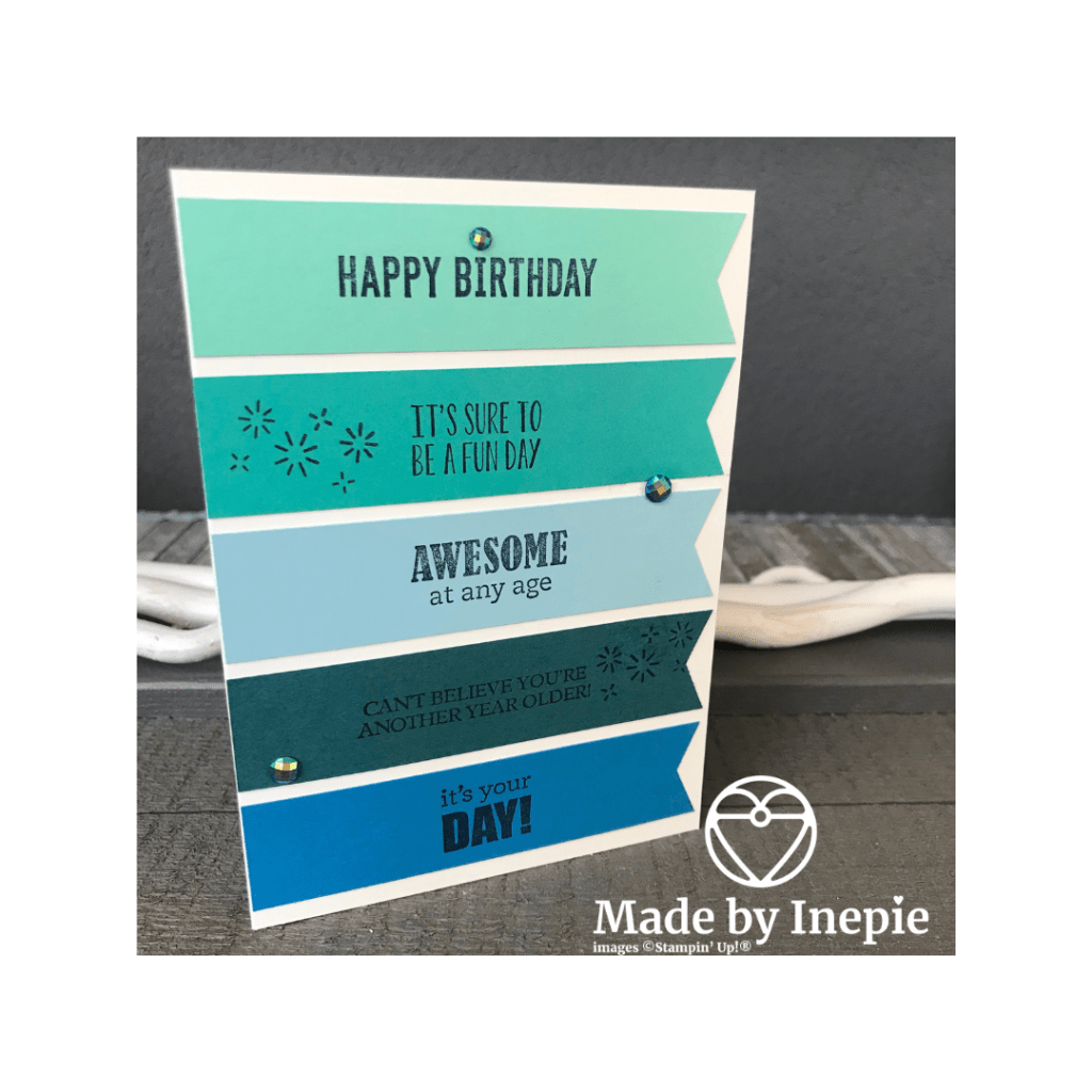 Deze kaart is echt heel makkelijk en kon eigenlijk ook voor de woensdag, want hij is gemaakt van restjes cardstock. Strookjes van 2,5 cm bij 10,5 cm en dan met de Banners Pick A Punch geponst. En bestempeld met 5 leuke teksten uit de geweldige Itty Bitty Birthdays set. Echt zoveel leuke teksten!